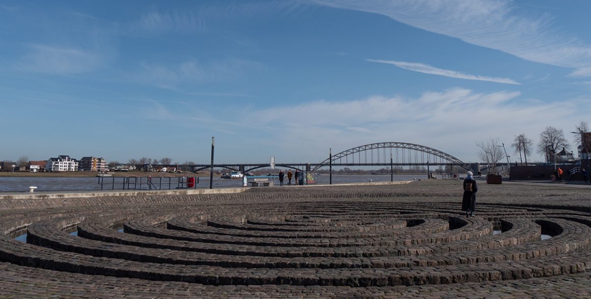 Waar nu de Waalkade is, lag ooit de oude Waalhaven. Voor de waterkeringsmuur op de kade kom je op de grond een groot kunstwerk tegen, geplaveid van basaltstenen: het Labyrinth. De Waalbrug – de enige oude brug uit deze wandeling – zie je al voor je. Onderlangs een klein haventje en een gezellig terras op een boot, loop je onder deze brug door.