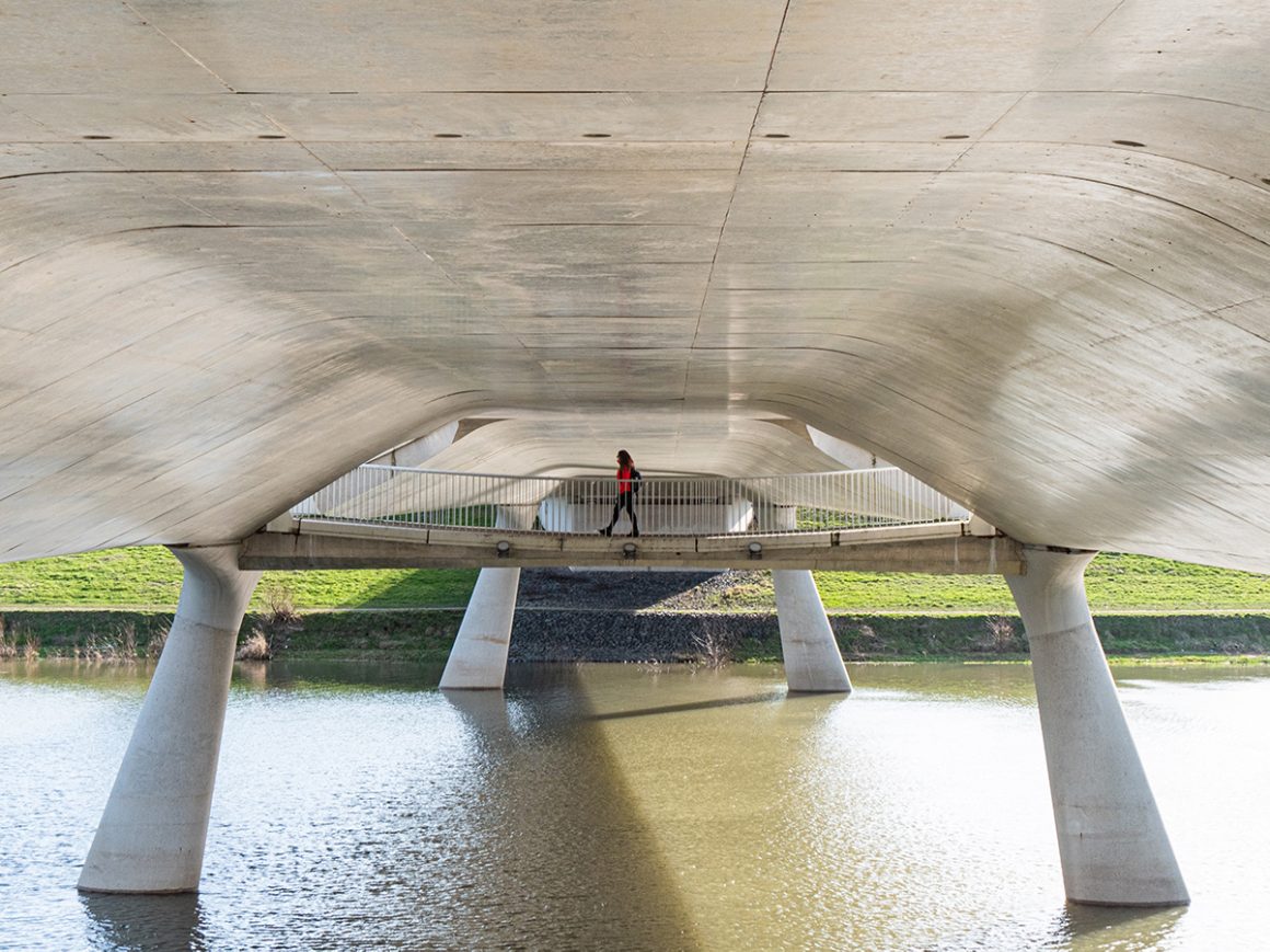 De volgende brug komt alweer in beeld: de Lentloper, een van de zes bruggen over de Spiegelwaal. Als wandelaar loop je onder het wegdek door en aan weerszijden staan luie ligstoelen, waarin je een prachtig uitzicht over de Waal hebt. Via de Spoorbrug en de Zalige Brug kom je uiteindelijk bij De Oversteek, de zevende en laatste brug van deze tocht.