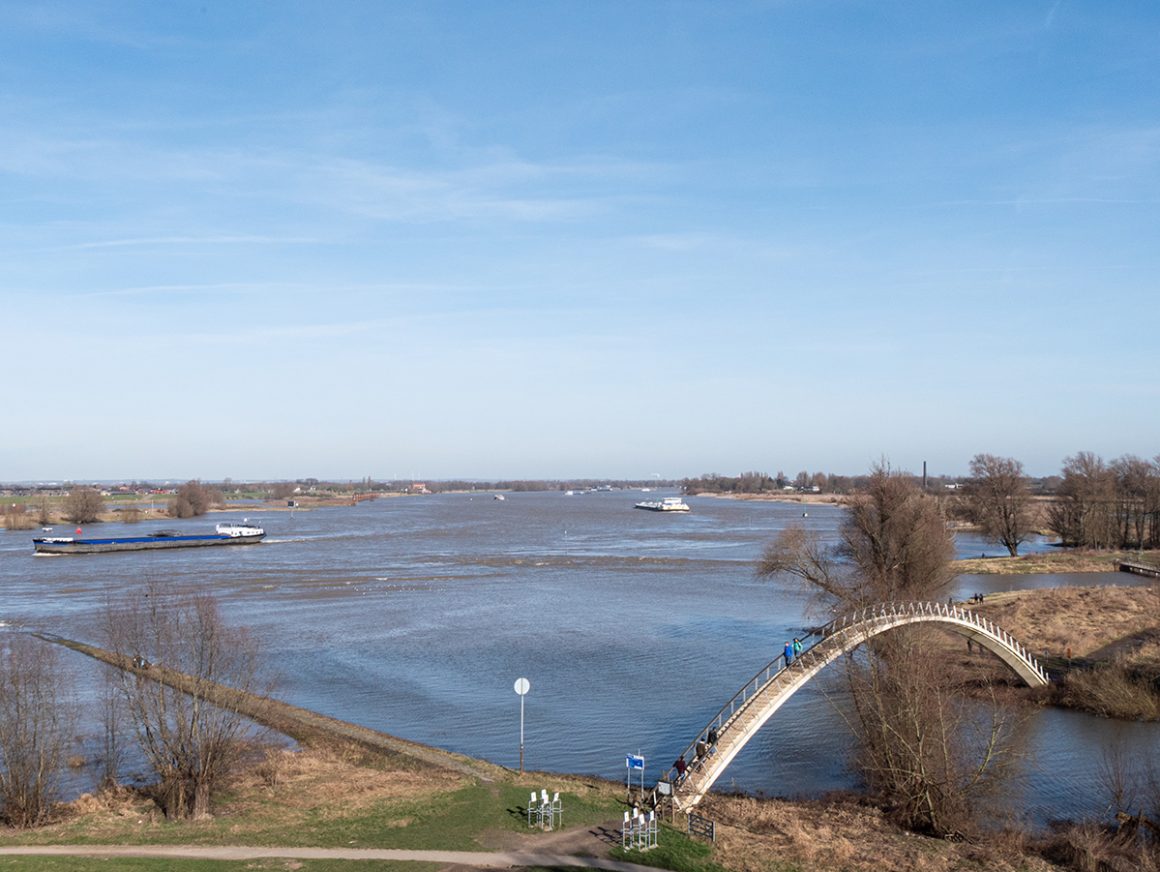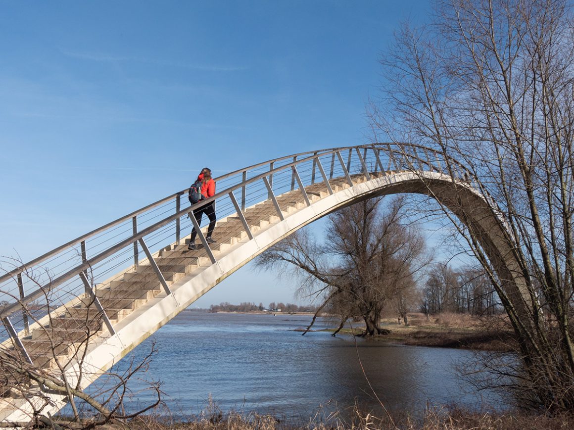 En dan ineens, als je onder de Waalbrug vandaan komt, ben je uit de stad en in de natuur. Voor je strekt de Ooijpolder zich uit, een natuurgebied aan de uiterwaarden van de Waal. Wandelbrug Ooijpoort (56 meter vrije overspanning) brengt je in een hoge boog naar de oase van rust en groen. Rechts in ’t Meertje liggen woonboten, wat een mooi plekje. Via een weiland loop je richting Ooijsedijk en kom je weer terug in de bebouwde kom van Nijmegen. Nu ga je niet onder de Waalbrug door, maar er overheen.