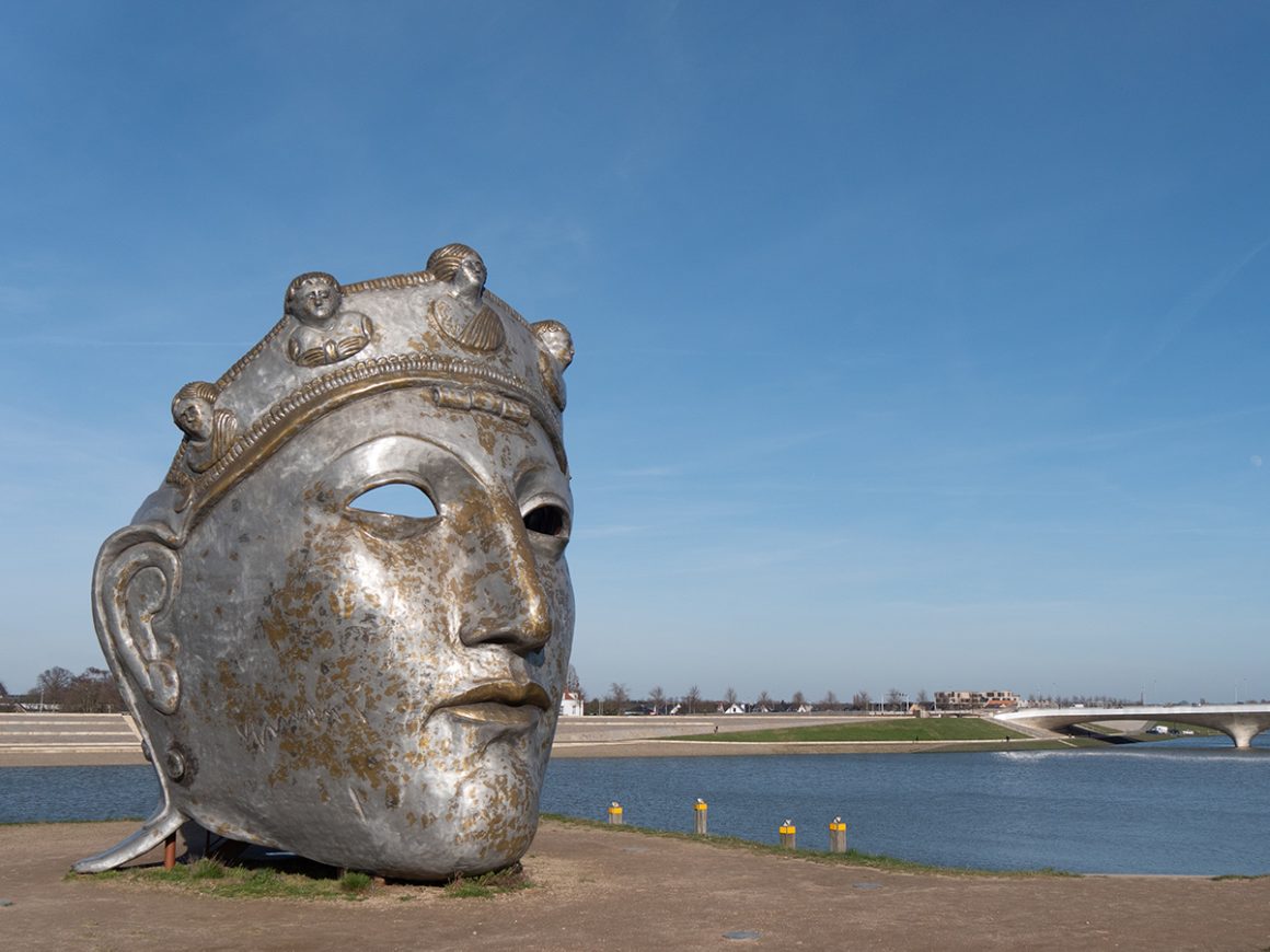 Vanaf hier loop je een flink stuk langs de noordkant van de Waal en over het stadseiland Veur-Lent. Dat ontstond toen de Waaldijk 350 meter landinwaarts werd gelegd en er een nevengeul werd gegraven, de Spiegelwaal. Je gaat over de Verlengde Waalbrug en passeert ‘Het Gezicht van Nijmegen’. Een enorm beeld van een Romeins masker, waar je in kunt klimmen en zo met een Romeinse blik naar Noviomagus (Nijmegen) kunt kijken. Het kunstwerk is geïnspireerd op een masker dat bij de Waalhaven gevonden werd en nu in museum Valkhof tentoongesteld staat.