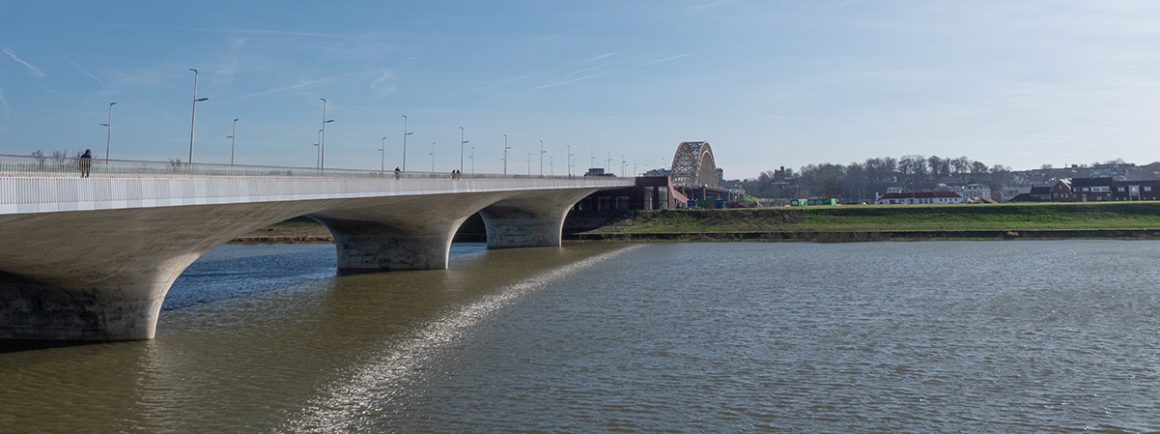 Deze brug over de Waal ligt op een historische plek: hier staken in 1944 Amerikaanse parachutisten in rubberbootjes de rivier over, in een poging Nijmegen te bevrijden. Als eerbetoon aan hen staan er aan weerszijden van de brug 48 lantaarnpalen, die ’s avonds paar voor paar ontstoken worden. Veteranen lopen dan de ‘Sunset March’, in hetzelfde tempo als waarin de lichten op de brug aangaan.