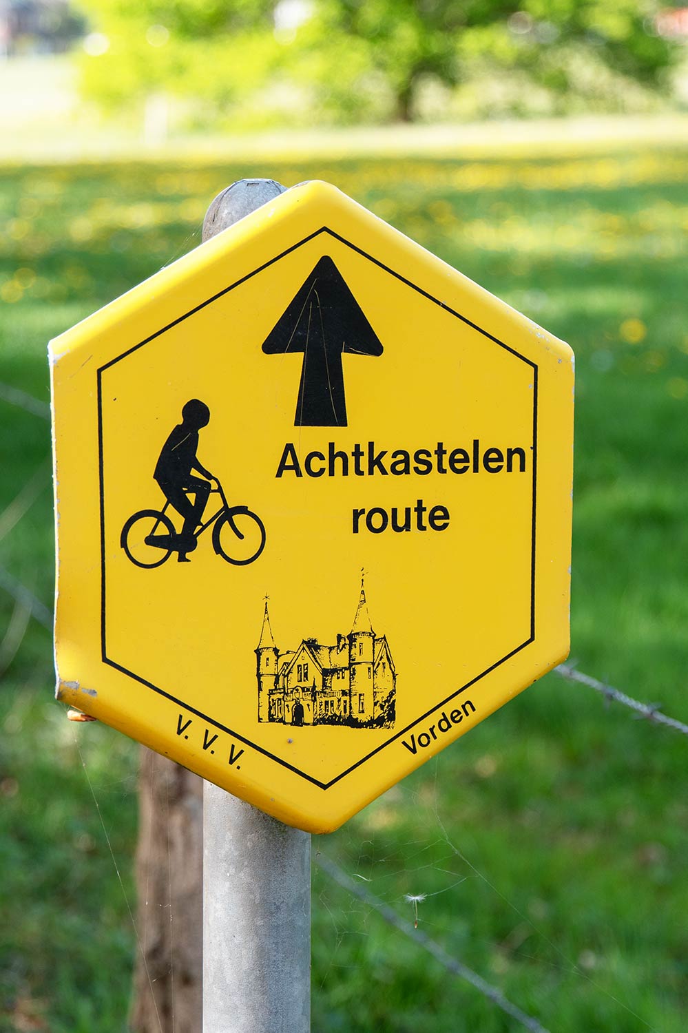 De route is aangegeven met handige gele bordjes, met daarop ‘achtkastelenroute’. en heeft een lengte van ongeveer 35 kilometer. De acht kastelen zijn: Kasteel Vorden, Kasteel Suideras, Kasteel Hackfort, Den Bramel, De Wildenborch, De Wiersse, Het Onstein en De Kieftskamp.