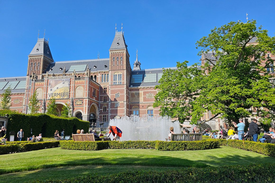 Neem de tijd om in de tuin van het Rijksmuseum te kijken en neem plaats op een van de vele stoeltjes. De gillende kinderen die spelen in de ‘bedriegertjes’, de fontein. Regelmatig is slechts een deel van de fontein hoog en zo kunnen de kinderen (en volwassenen) middenin, tussen de omhoog spuitende stralen, staan. Een genot om naar te kijken en te luisteren naar de gillende, plezierige kreetjes.