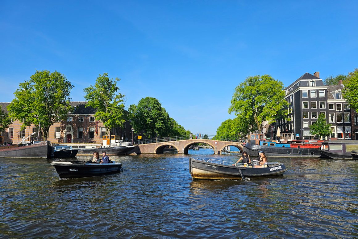 Op diverse plekken zitten mensen voor de grachtenpanden te relaxen op bankjes of worden er op de bruggetjes door toeristen foto’s gemaakt. Ook zien we enorm veel fietsers. Het schijnt dat er meer fietsen in Amsterdam zijn dan inwoners. Het varen met een rondvaartboot vergt nogal vakmanschap. De kapitein toont regelmatig zijn skills.