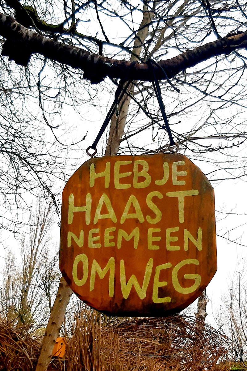 • Het Omwegpad leidt je door de iconische toegangspoort, over de grasdijk om Ruigoord heen. Je ziet het beeld van de Heilige Geertruida en een enorme krab, beide gemaakt van sloopafval.