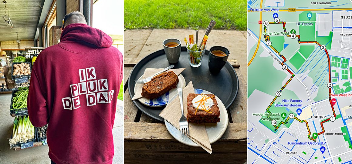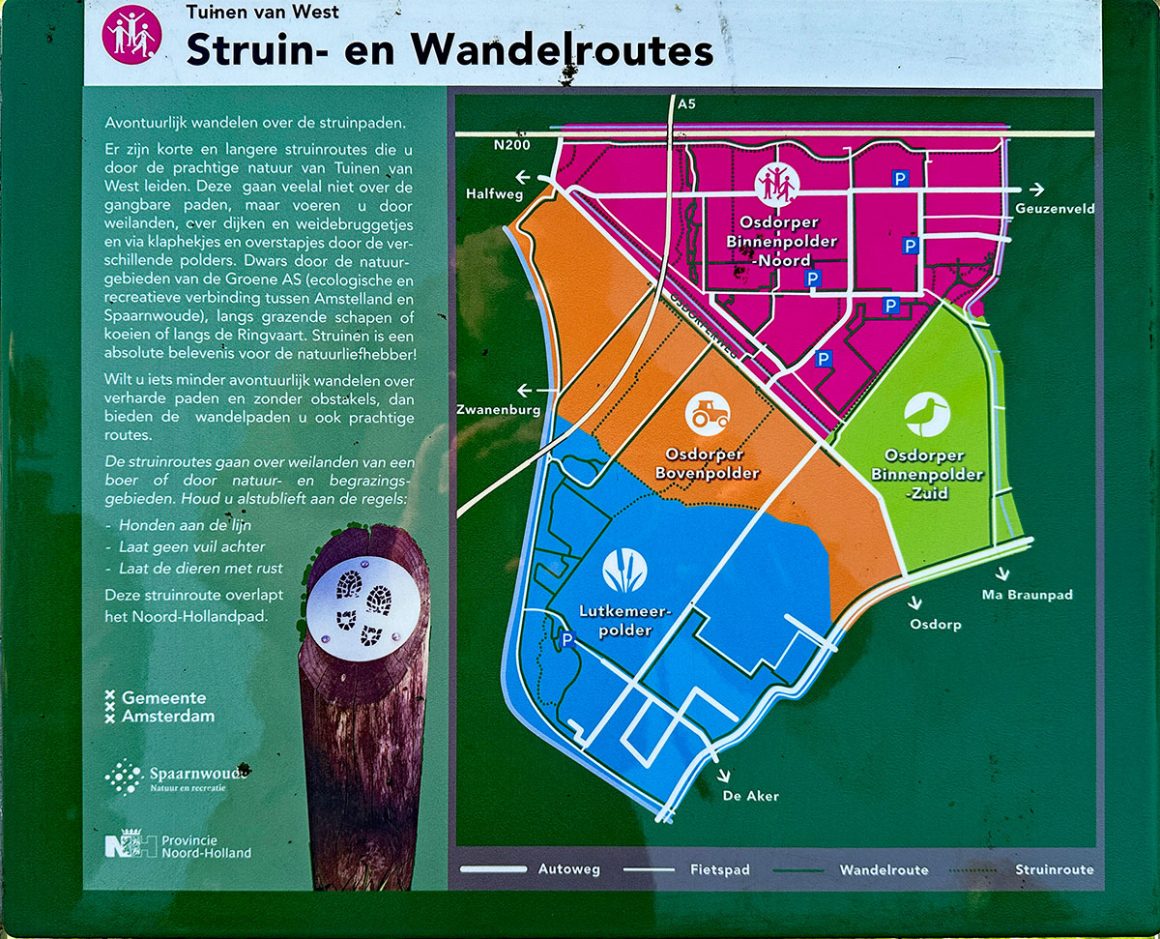 Het Ma Braunpad brengt ons in de ‘Tuinen van West’ met zijn vier polders: de Osdorper Binnenpolder Noord en Zuid, de Osdorper Bovenpolder en de Lutkemeerpolder. Allemaal hebben ze hun eigen signatuur en op de website is daar alles over te vinden. Net als wandelingen, fietstochten en kunstroutes. Maar ook oogstdagen en actieve ondernemers.