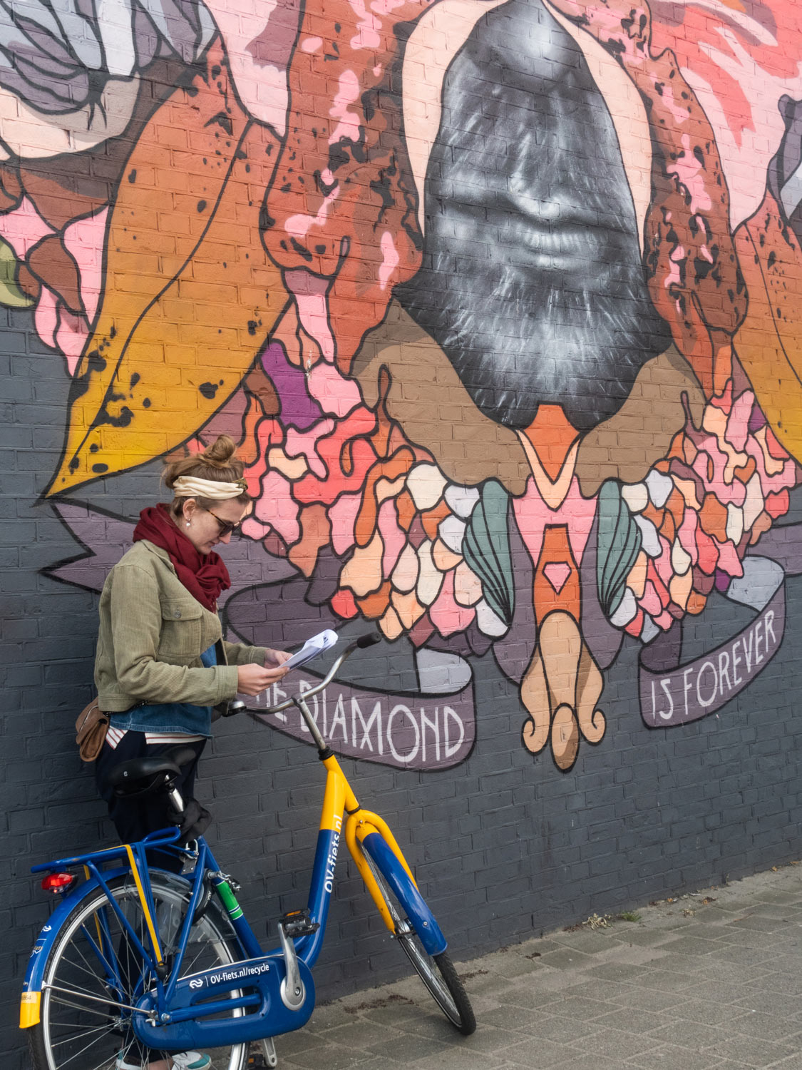 De 12,5 kilometer lange rit langs de muurschilderingen zorgt voor verrassing en verwondering. Het is geen opgepoetste standaardroute langs (historische) pronkjuwelen. Je komt op plaatsen in de stad, waar je anders waarschijnlijk aan voorbij zou gaan. Zoals de Veilingkade, een vrijplaats voor creatieve ondernemers. Verhalen van buurtbewoners waren daar de inspiratie voor een gigantische, paradijselijke schildering op een van de muren van dit voormalige bedrijventerrein.