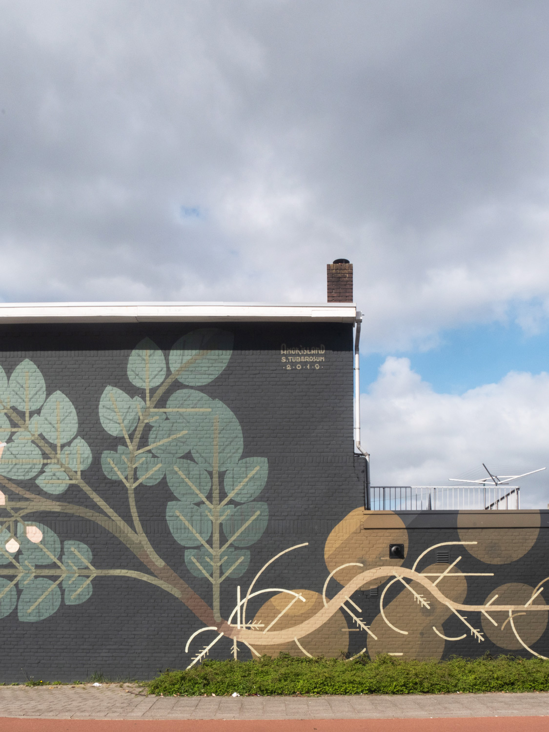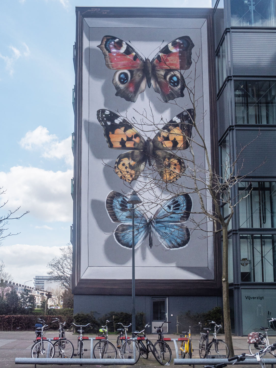 In een van de buitenwijken waar je doorheen fietst, staat nogal wat hoogbouw. Weinig ruimte voor de natuur. Daarom schilderde een street artist drie reusachtige tuinvlinders op de muur van een van de vele flatgebouwen. Zo bracht hij een stukje natuur in de stadse omgeving. Even verderop groeit er weer een giga-aardappelplant op een tuinmuur. Geen toevallige plek, het is namelijk de Vincent van Goghlaan.