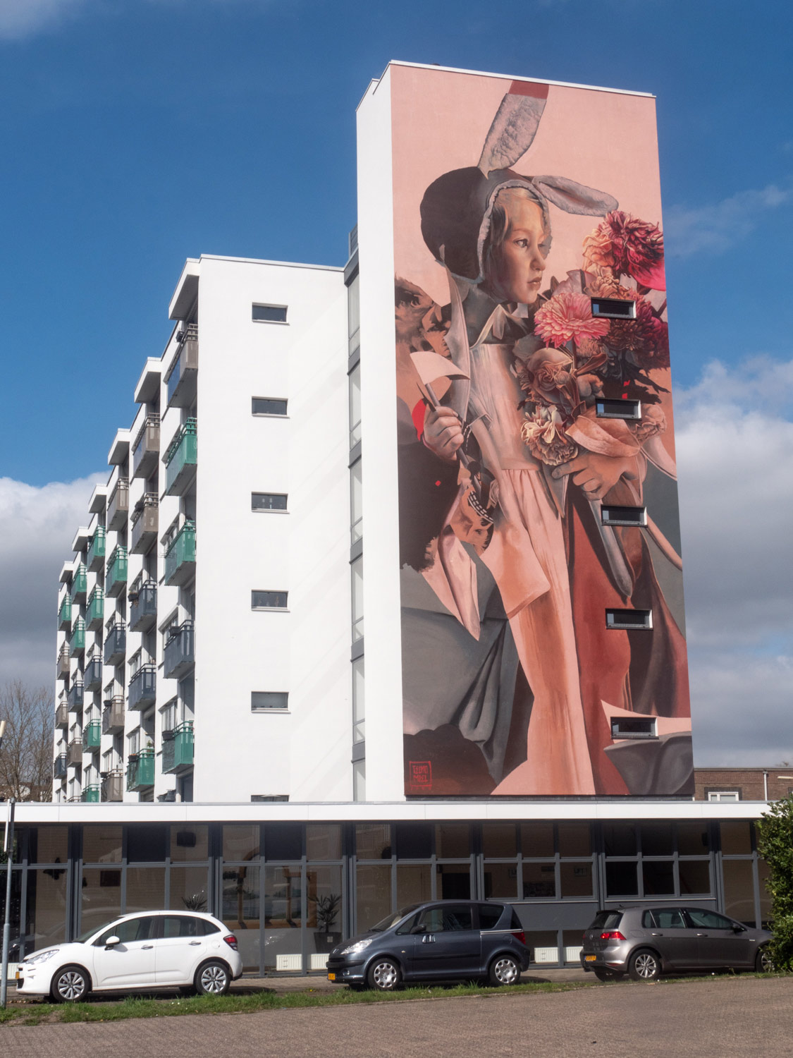 Verhalen over de oorlog spreken altijd tot de verbeelding, dus ook op de Blind Walls vind je ze terug. Twee van de 28 street art projecten uit de fietsroute herinneren aan die donkere tijden. Al zou je dat van ‘de Vlucht’ – een bijna romantische, roze-paarse schildering op de zijkant van een flatgebouw – niet zeggen (achteromkijken als je de route fietst, anders mis je ‘m).