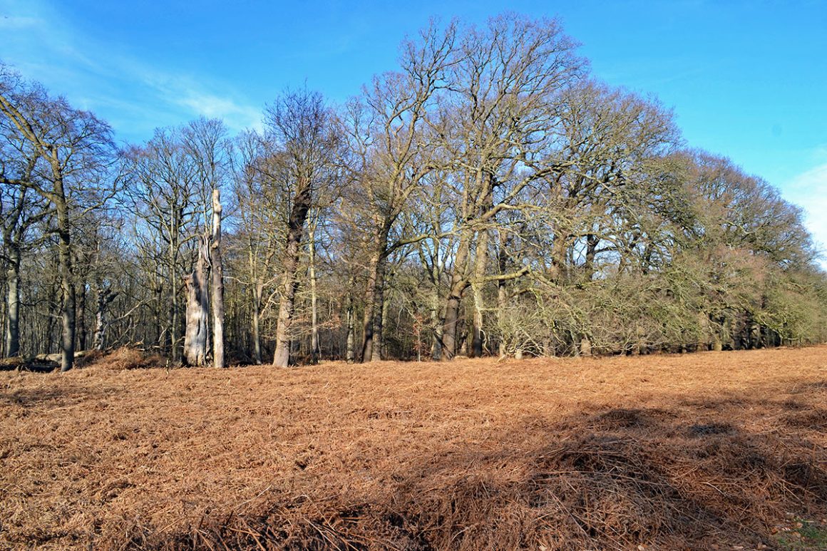 Dan opeens een wat groter open gebied, de vroegere paardenrenbaan Woestduin. Het is dat ik het had gelezen, want je ziet het niet… Afhankelijk van het jaargetijde zie je in dit open gebied groene varens of afgestorven bruine varens.
