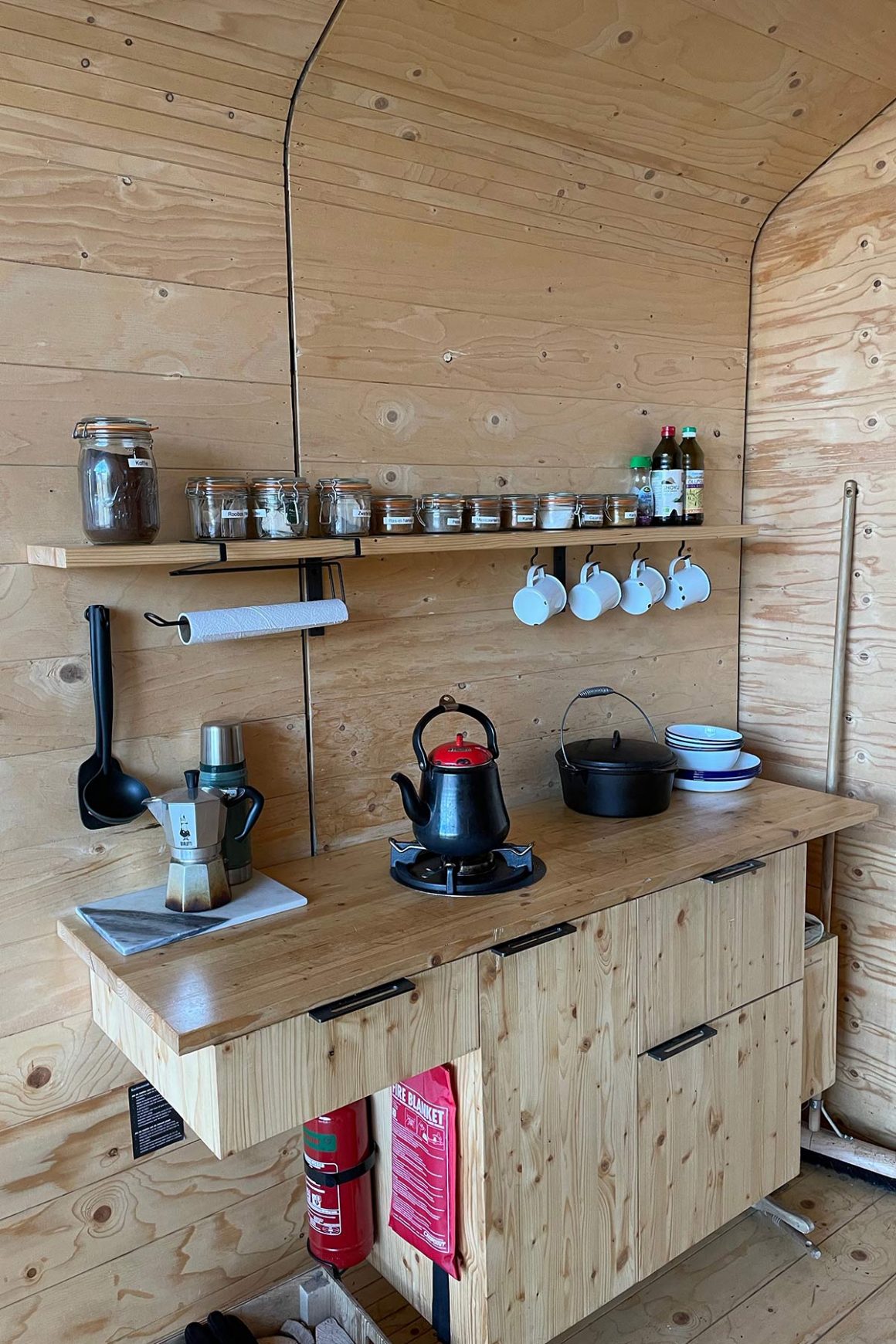 Als je reserveert, kun je ook een maaltijdpakket bestellen die je vervolgens bij het startpunt van de wandeling kunt oppikken. Onze ervaring is dat dit wel echt deel van de beleving is, dus zeker doen! In de cabins hangen receptenboekjes en met de biologische en lokale ingrediënten kun je overheerlijke eenpansgerechten maken. Je kunt ook een extra lunch- en snackpakket bestellen.