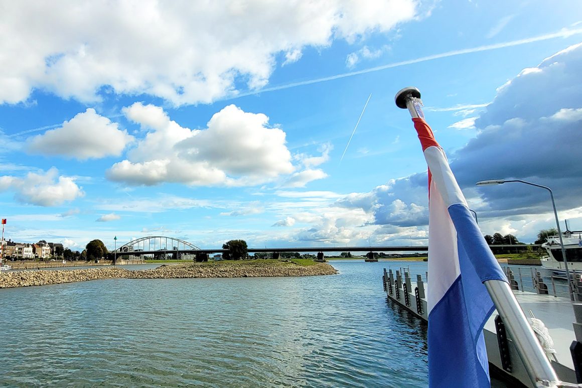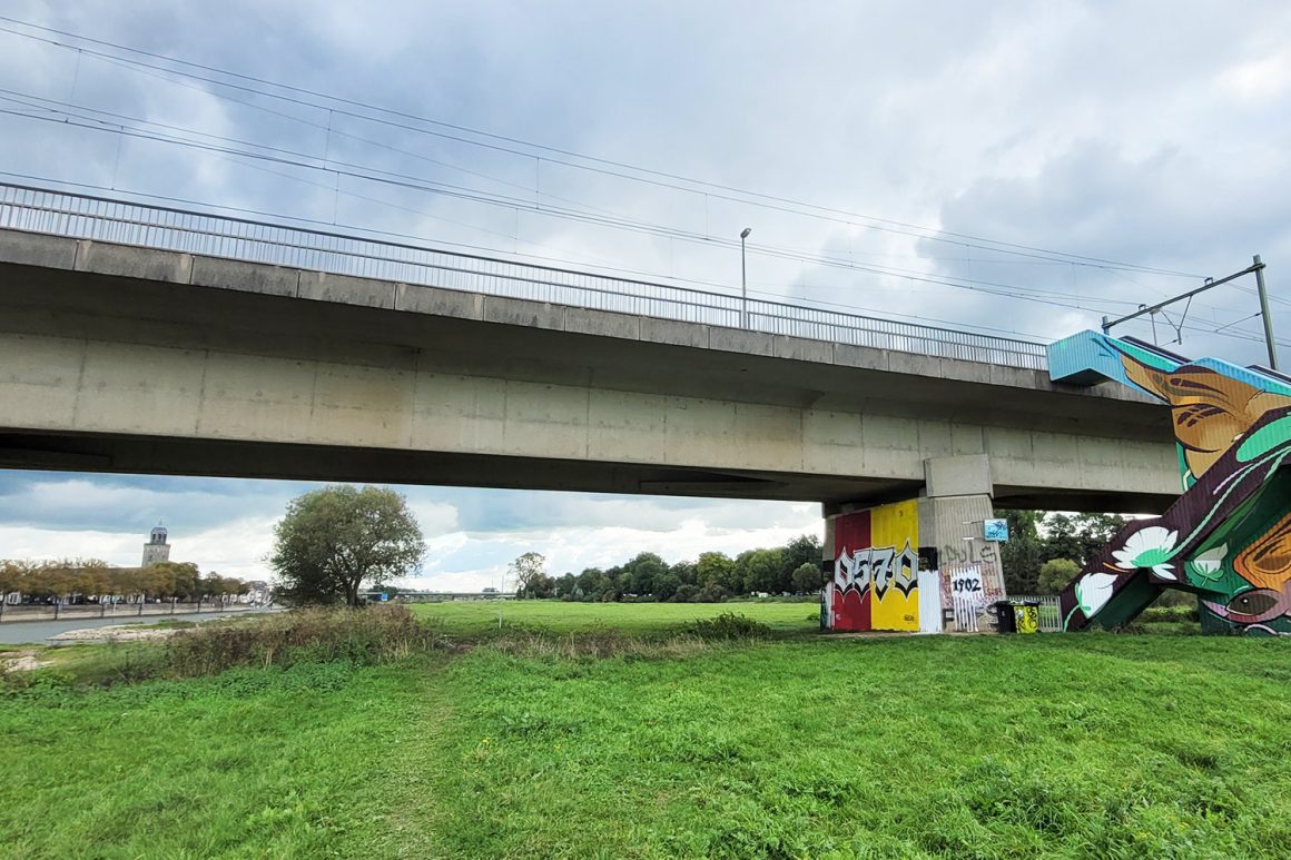 Via het park en de oranje route kom je aan bij een spoorviaduct aan het einde van de Singel. Je steekt de straat over en vervolgt je weg langs het parkje onder langs de spoorlijn richting de IJssel. Bij de IJssel ga je rechts onder de spoorbrug door, waar je gelijk rechts de trap oploopt om de spoorbrug over te wandelen naar de overkant van de IJssel. De linkerkant van de spoorbrug is fietspad, de rechterzijde is voetpad.