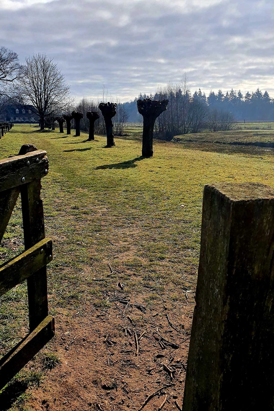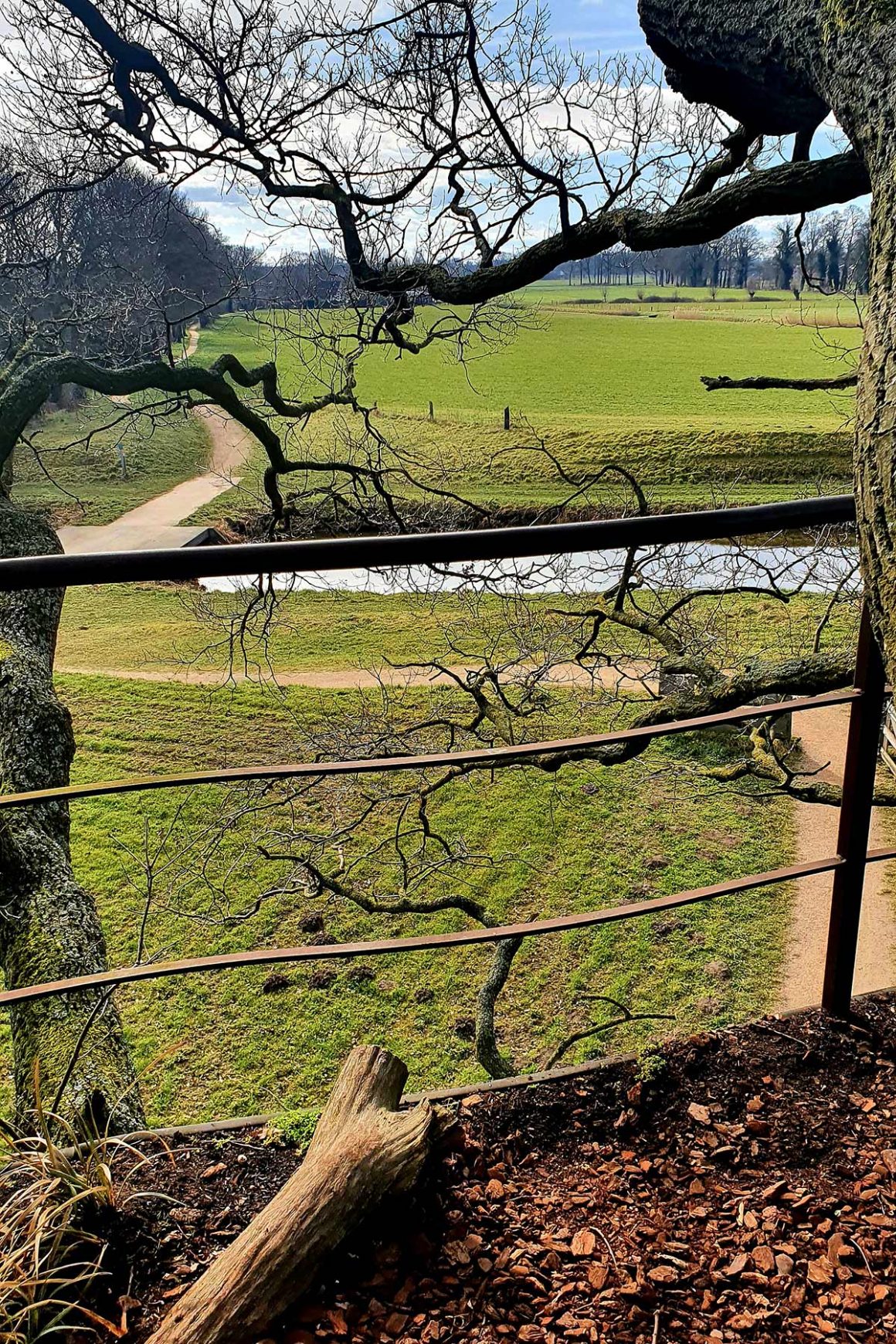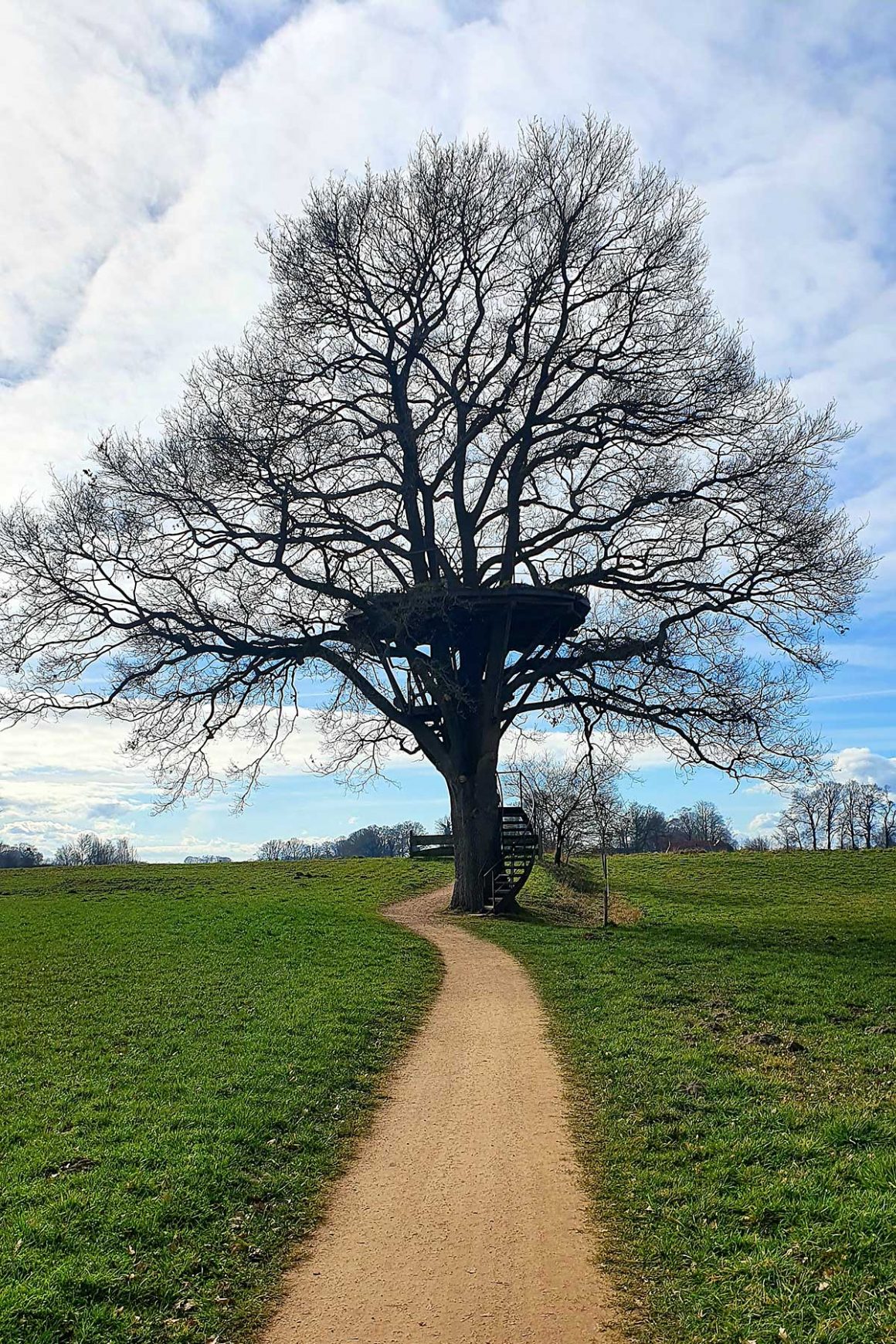 Aan het eind van de akker ga je linksaf het klaphek door. Wandel over het prachtige wilgenlaantje en ga rechts om het huis. Je komt weer bij een klaphek en je vervolgt rechts langs de sloot. Bij de kruising recht oversteken, klaphek door en je wandelt over een slingerend pad naar de 250 jaar oude eik: dé boomtuin. Via een wenteltrap, die zich langs de stam van de oude eik krult, kom je op een plateau waarop een boomtuin is aangelegd. Compleet met een bankje, waar je even heerlijk kunt genieten van het uitzicht op de Schipbeek en de weilanden. Neem de omgeving even goed in je op, het is hier zo mooi.