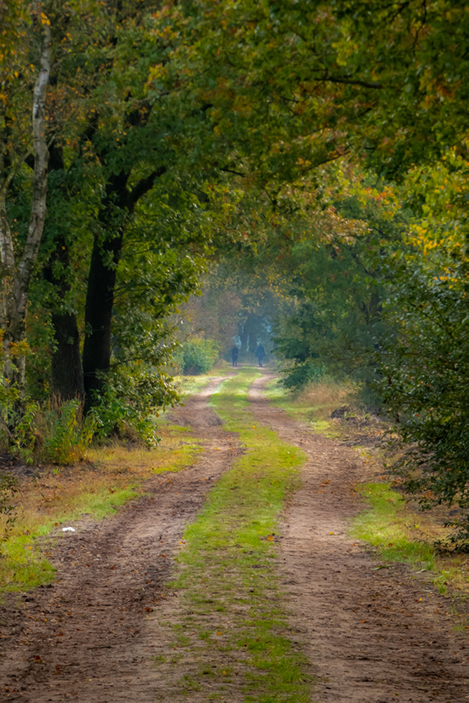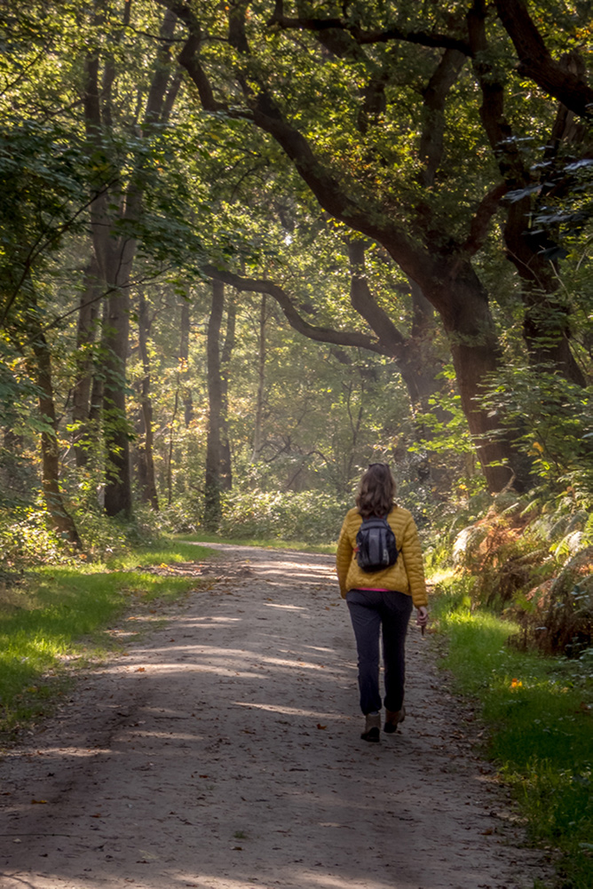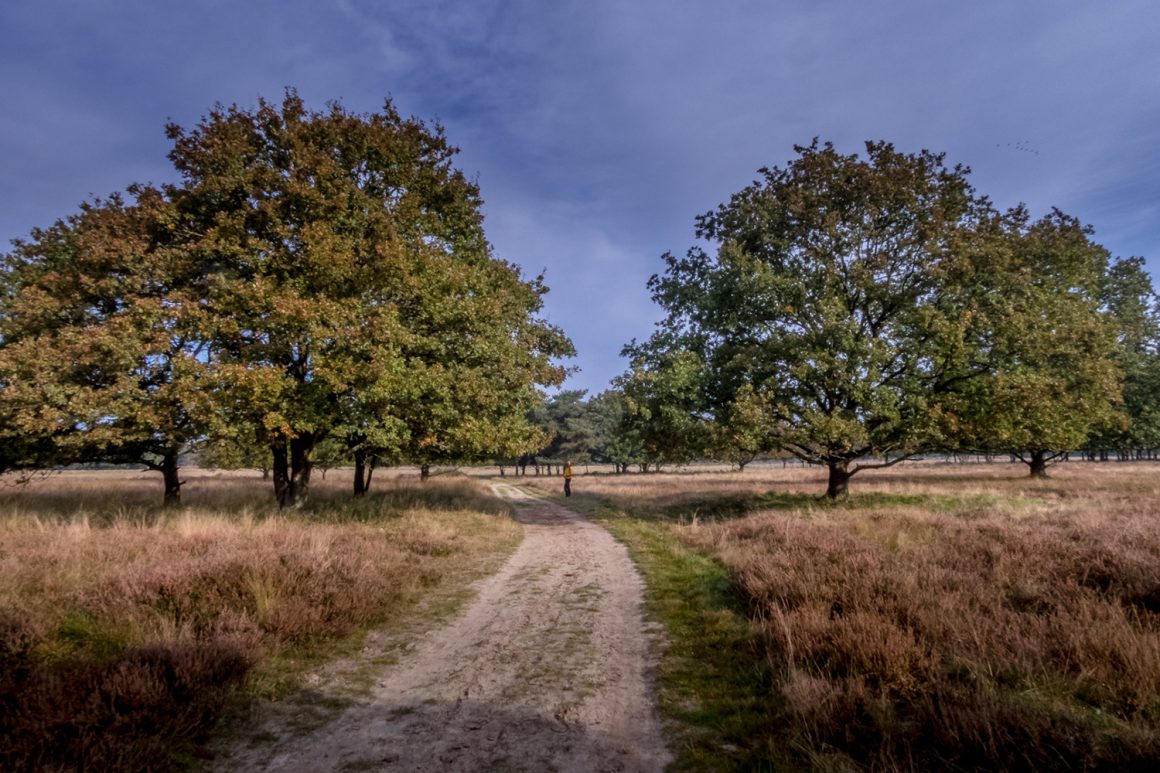 De paden zijn vooral onverhard en slingeren door het heidegebied en door het bos. We stoppen regelmatig om foto’s te maken. Ik met mijn mobiel en mijn zus, de fotografe, pakt het professioneler aan. We kunnen bijna niet stoppen met foto’s maken. We vinden alles geweldig. De kleurende bladeren, de webben, een bijzondere tijgerspin die zijn web gesponnen heeft in het struikgewas en de zon die op de bladeren schijnt. Het contrast van de blauwe lucht met de groene weilanden en het nog volle bladerdek van de bomen is een plaatje. We maken er dankbaar gebruik van.