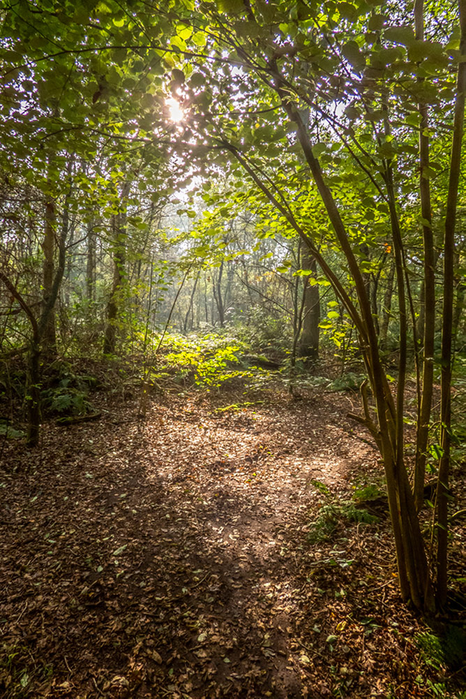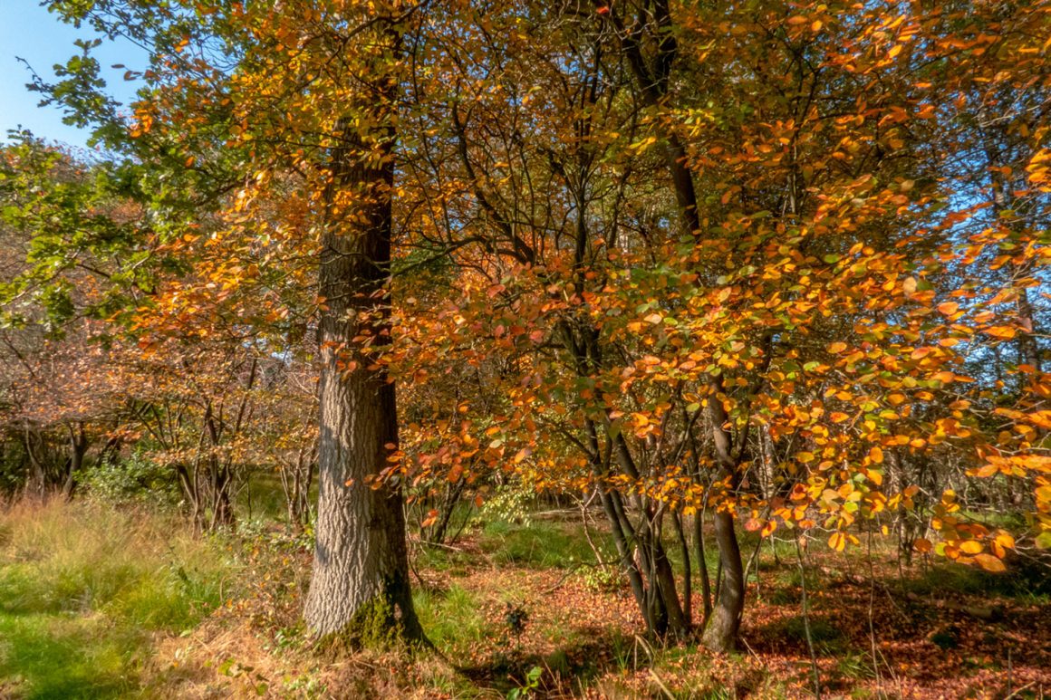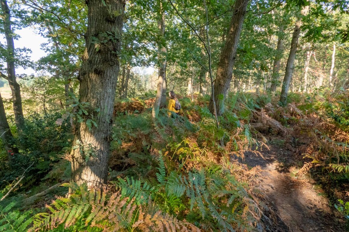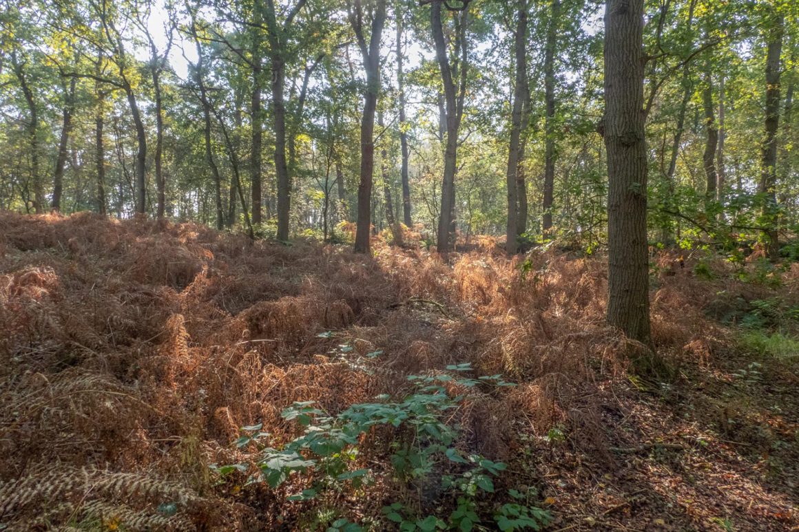 Het bos oogt wat rommelig, maar de kleurenpracht is bijzonder. Het groene bladerdek zorgt voor kleur, want de varens die de bodem van het bosgebied bekleden, zijn al bruin verkleurd. Links en rechts van het pad zien we overal dode bruine varens, die door de zonnestralen een glanzende roestbruine kleur krijgen.