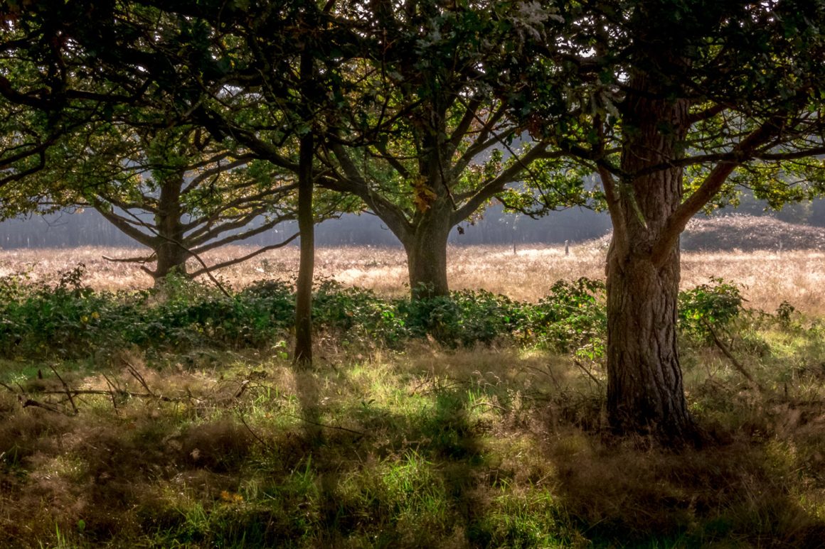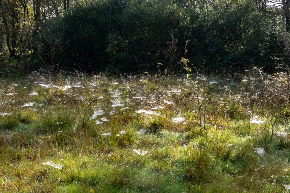 Het gebied is redelijk bekend voor ons, maar we ontdekken altijd weer wat nieuws en elk seizoen brengt variatie. We lopen langs de molen en treden, via een open gebied, het heideveld binnen. De natuur heeft nu een feeërieke sfeer door de dauwdruppels van de vroege ochtend en de vele webben die overal tussen de heide zijn geweven. De ochtendzon schijnt er doorheen, dat geeft een prachtig beeld.