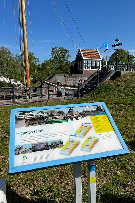 Links de dijk op brengt je na 1,5 km bij de zeesluizen van Edam. Een mooie verwijzing naar het verleden toen Edam verbonden was met de zee. Altijd leuk om zo’n sluis te bekijken als er net een schip geschut wordt.