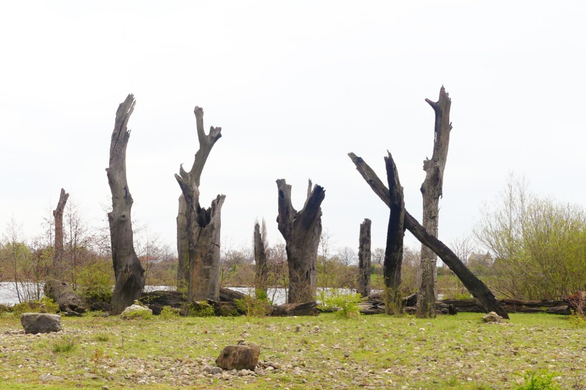 Als we verder lopen, komen we langs een bomenmonument. Dit zijn oude zwarte eikenstammen (2000 jaar oud) die bij de grindwinning weer naar boven zijn gekomen.