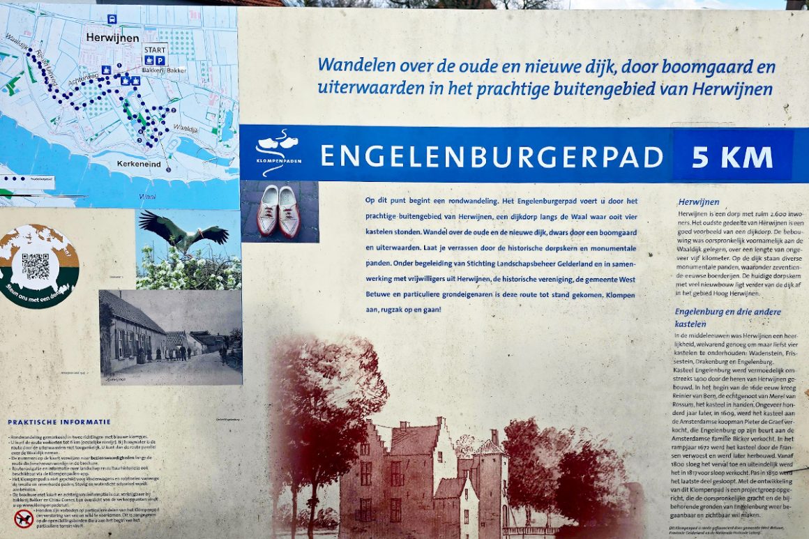 Ontdek tijdens dit klompenpad het mooie buitengebied van Herwijnen in de Betuwe. Wandel over de dijk, dwars door een boomgaard en langs de uiterwaarden. Laat je verrassen door de vele ooievaars in dit gebied en de historische dorpskern met vele monumentale panden. Het Engelenburgerpad is een mooie rondwandeling van 5 kilometer.