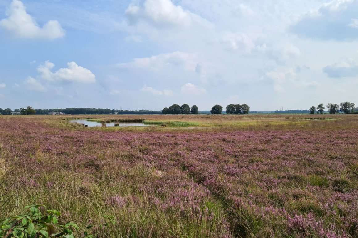 Na een moment van bezinning fietsen we verder door bossen en watertjes als – tot mijn grote verrassing – opeens het Hijkerveld voor ons ligt. Direct achter het veerooster ligt een kudde Schotse Hooglanders te herkauwen onder een boom. Enigszins onder de indruk van deze enorme dieren fietsen we het Hijkerveld binnen en genieten van de paarse pracht van de heide en de vennetjes. De hooglanders trekken zich niks van ons aan. Ik houd zoveel van de heide als die bloeit, dat ik mijn geluk niet op kan dat ik uitgerekend nu deze route fiets. Er lopen meerdere fiets- en wandelpaden over de heide dus we komen hier zeker nog eens terug.