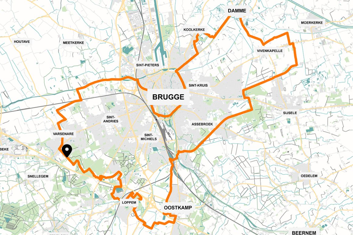 Knooppunten: 90 - 61 - 94 - 59 - 99 - 97 - 13 - 93 - 82 - 82 - 69 - 24 - 54 - 75 - 52 - 16 - 21 - 61 - 42 - 28 - 6 - 34 - 10 - 97 - 50 - 23 - 3 - 98 - 5 - 49 - 46 - 4 - 36 - 65 - 21 - 1 - 8 - 48 - 68 - 90 Lengte: 56 kilometer Normale fiets: 3 uur en 27 minuten Elektrische fiets: 2 uur en 48 minuten Beginpunt & parkeren: Een goed begin om deze fietsroute te starten is Parking Beisbroek, te vinden aan Doornstraat 358 in Brugge. Knooppunt 90 vind je hier direct op de kruising.