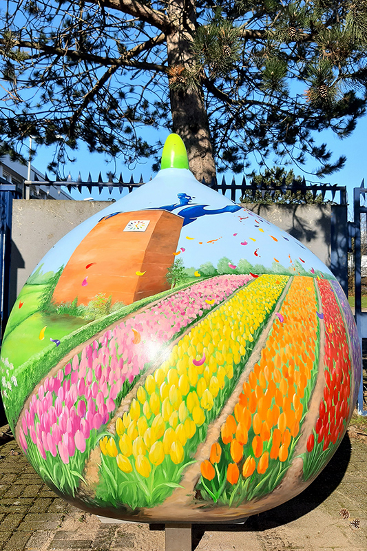 Ben je niet tijdens de bloeitijd in de Bollenstreek bij Lisse, maar wil je toch tulpenbollen zien? Dan zijn de Giant Tulip Bulbs erg leuk om te spotten. Deze manshoge kunstwerken in de vorm van een tulpenbol zijn beschilderd door kunstenaars uit de Bollenstreek. De onderwerpen hebben allemaal een relatie met deze streek. Er komen in totaal tachtig van deze reuzenbollen te staan tussen Leiden en Haarlem. Bedrijven en gemeenten kunnen deze bollen adopteren en meedenken over de beschildering.