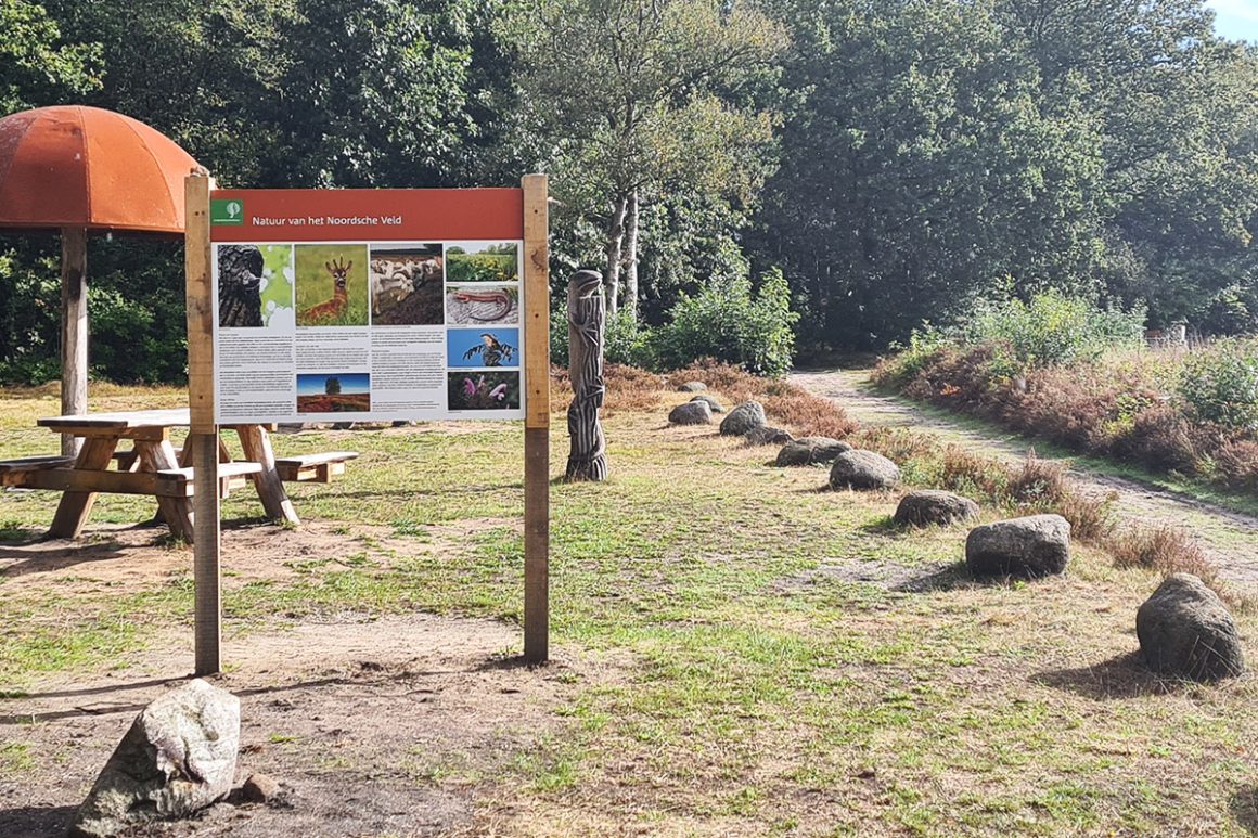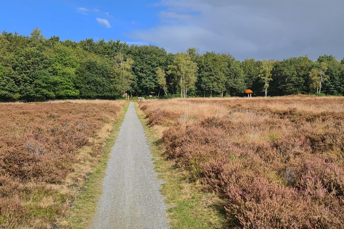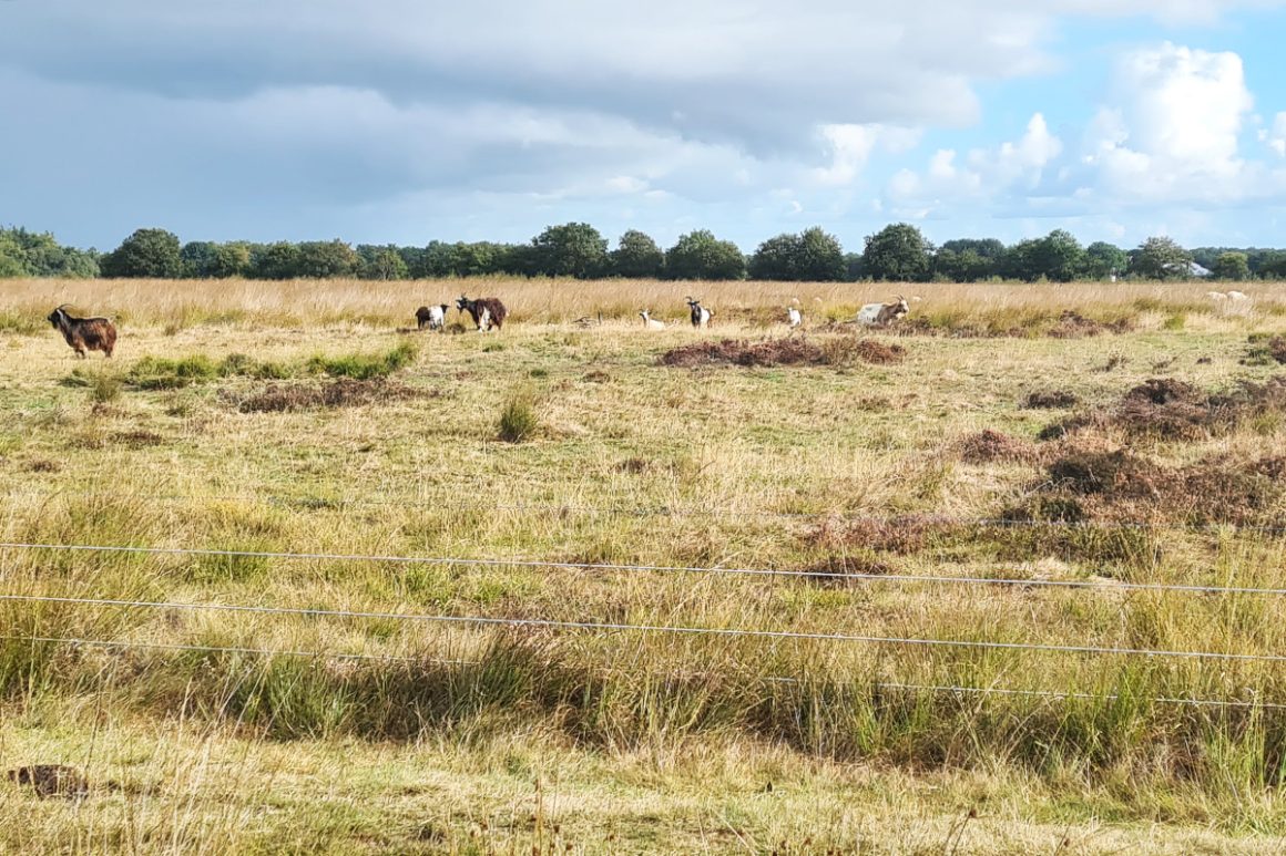 Al snel komen we terecht in een heerlijk natuurgebied ‘het Noordsche Veld’ waar ik altijd heel blij van word. Aan de ene kant de paarse kleur van de heide en aan de andere kant van het pad grazen een paar geiten die net als wij hopen dat het droog blijft. In de verte zien we een oranje parasol staan en terwijl de eerste druppels vallen, bereiken we een geweldig leuk rustpunt waar we inderdaad kunnen schuilen.