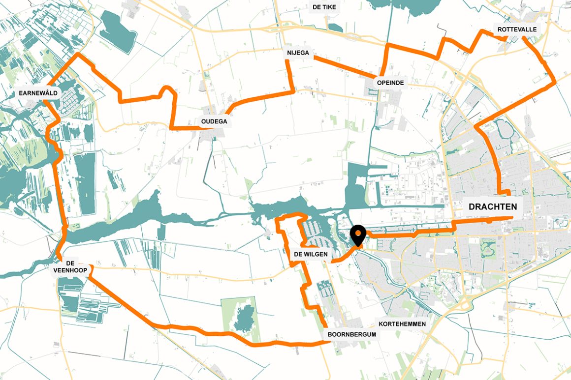 Knooppunten: 62 - 64 - 18 - 88 - 94 - 49 - 12 - Pont - 06 - 14 - 16 - Pont - 38 - 39 - 40 - 44 - 67 - 89 - 95 - 46 - 55 - 26 - 02 - 04 - 06 - 08 - 31 - 36 - 66 - 58 - 62 Lengte: 45 kilometer Normale fiets: 2 uur en 47 minuten Elektrische fiets: 2 uur en 15 minuten Beginpunt & parkeren: Een goede plek om deze fietsroute te starten, is Parkeerplaats oude Drait, te vinden ter hoogte van Postlaan 54 in Drachten. Knooppunt 62 vind je ten westen van de parkeerplaats op de plek waar de Postlaan en Buitenstvallaat elkaar kruisen.