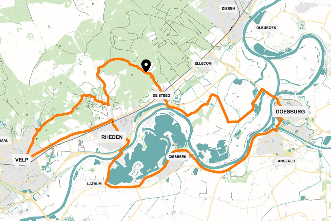 De route gaat ook door de plaatsen Rheden en Lathum, mooie plekken om even af te stappen. In het dorp De Steeg fiets je langs Kasteel Middachten. Gelegen op de overgang van de hoge zuidelijke Veluwezoom naar de lage uiterwaarden van de IJssel. Het sjieke Landgoed Rhederoord, dat dienst doet als hotel, ligt er nagenoeg tegenover.
