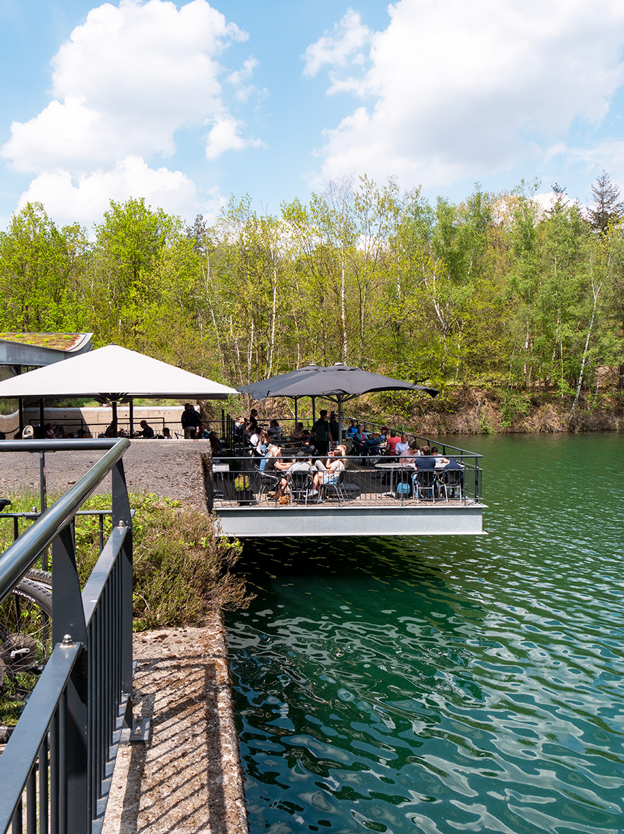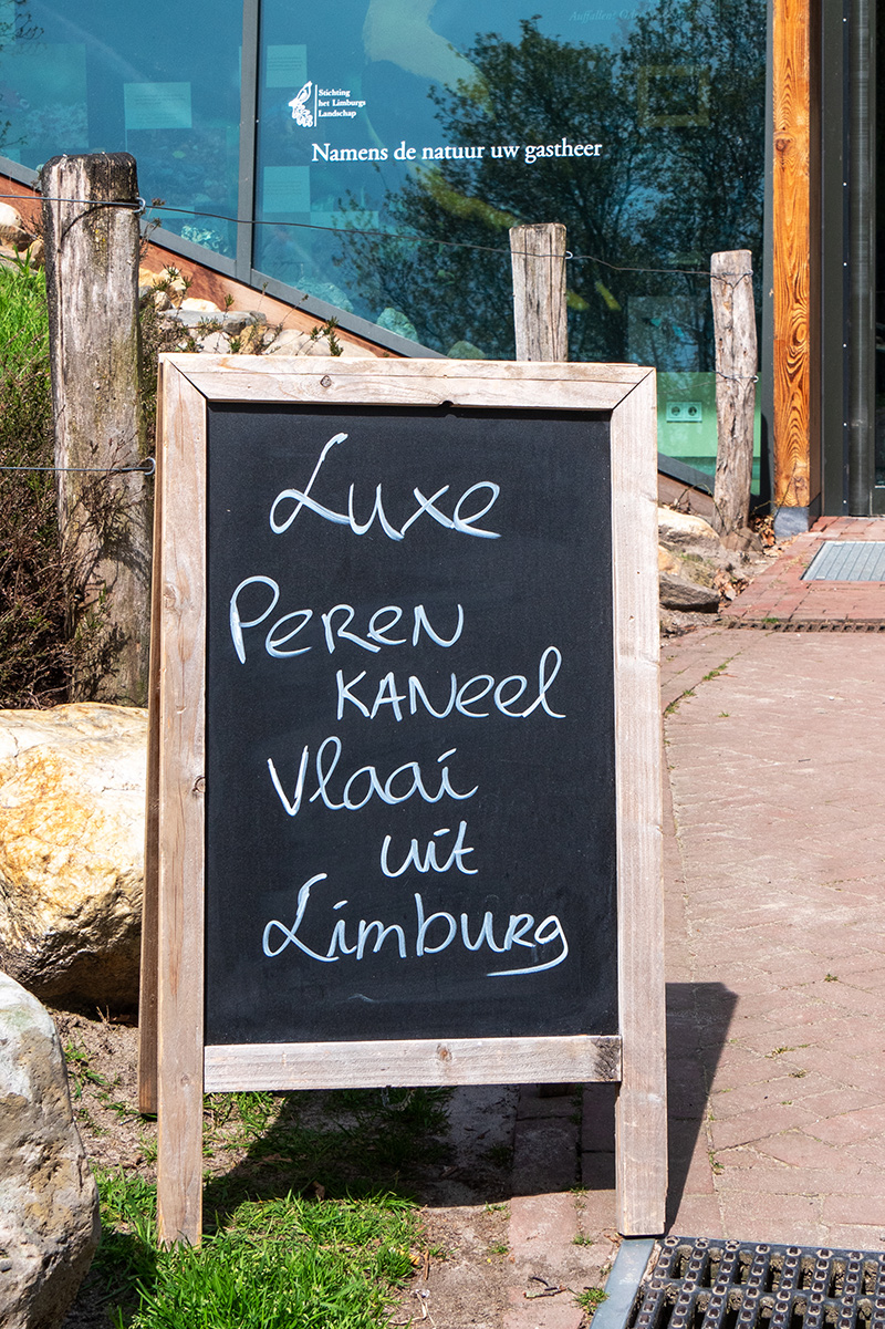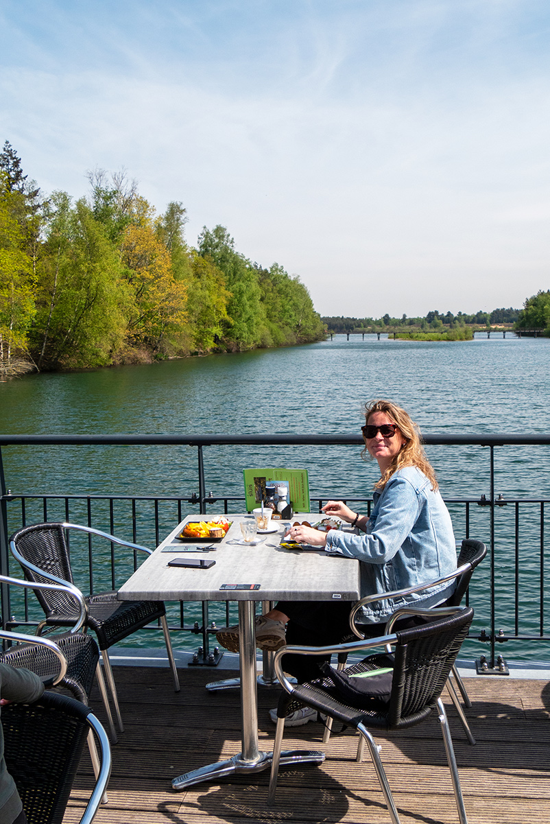 Eenmaal terug bij het bezoekerscentrum kun je nog een drankje drinken op het terras. Een terras dat bovendien bijzonder gelegen is, het hangt namelijk in een oude sluis. Wij namen er uiteraard een stuk Limburgse vlaai bij, die heb je wel verdiend na zo’n ronde.