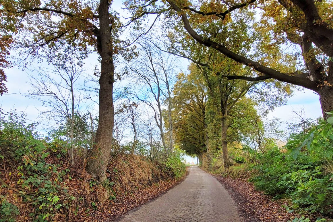 Aan het eind ga je linksaf, maar kijk eerst even naar rechts voor een landelijk beeld op de boerderijen aan de Aalpolsweg. Je loopt vervolgens over een smalle klinkerweg door een kleine slenk, waarna om de hoek een prachtig smal hoog huis opduikt met uitzicht over de akkers en op het dorp. De huidige bewoner biedt je de mogelijkheid om in een kast je schoenen voor reparatie aan te bieden.