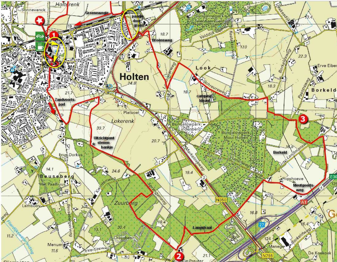 Aan het einde van de Langstraat moet je de drukke N350/N755, Markeloseweg oversteken. Je loopt verder over de Heideweg met aan de linkerzijde een bungalowterrein, buurtschap De Borkeld. Bij het eerstvolgende kruispunt ga je rechtsaf, de Meutgeertsweg. Eerst is het wat kaal en een klein stukje langs de snelweg A1 wandelen, maar al snel wordt het weer groener met een lichte glooiing om vervolgens via diverse bospaadjes verder te wandelen richting Pasopsweg, Borkeldsweg en Schreursweg.