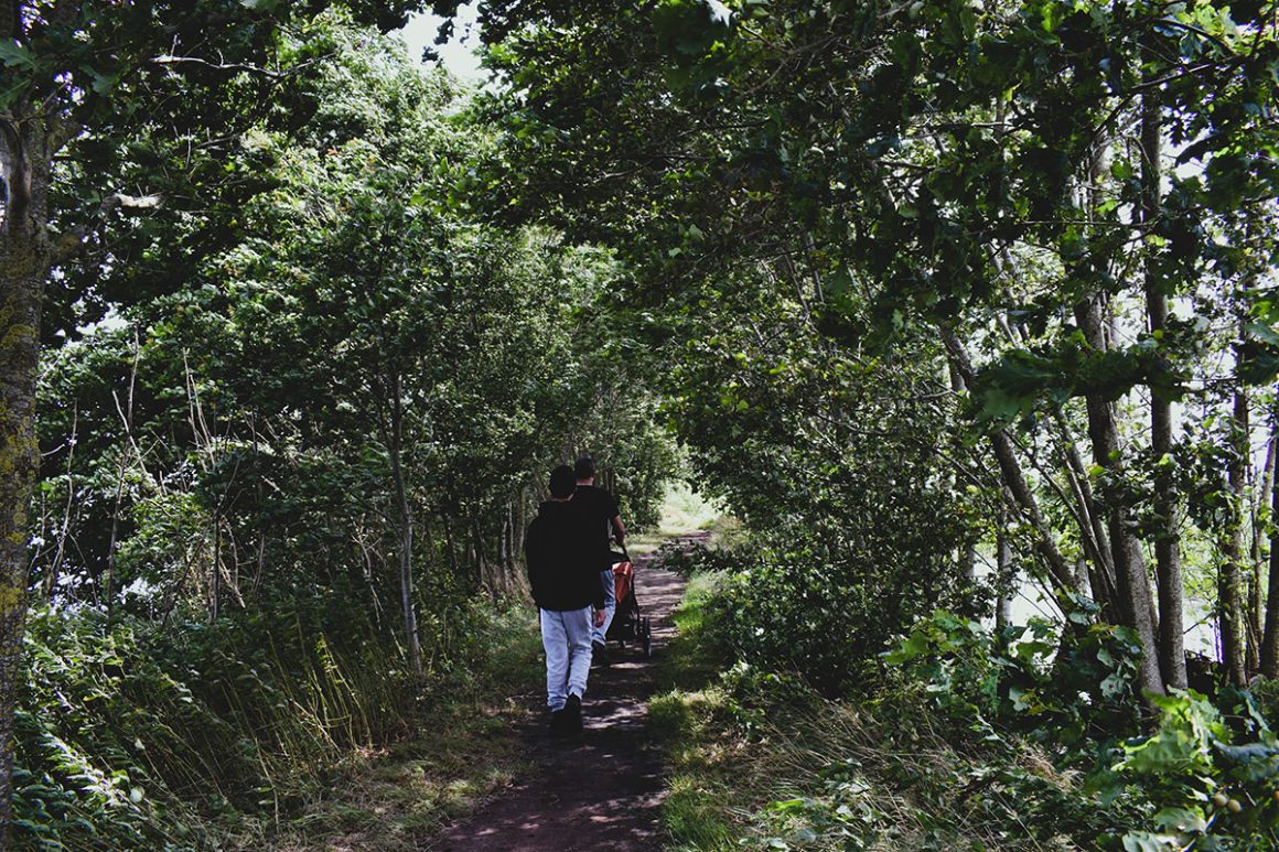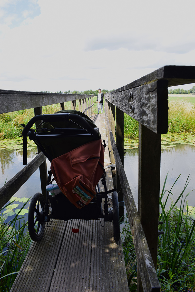 Zo eigenwijs als wij fanatieke wandelaars zijn, hebben we de wandelwagen mee en op sommige stukken moet je toch wel even creatief zijn. Zo ook bij een bruggetje, het past gelukkig allemaal net.