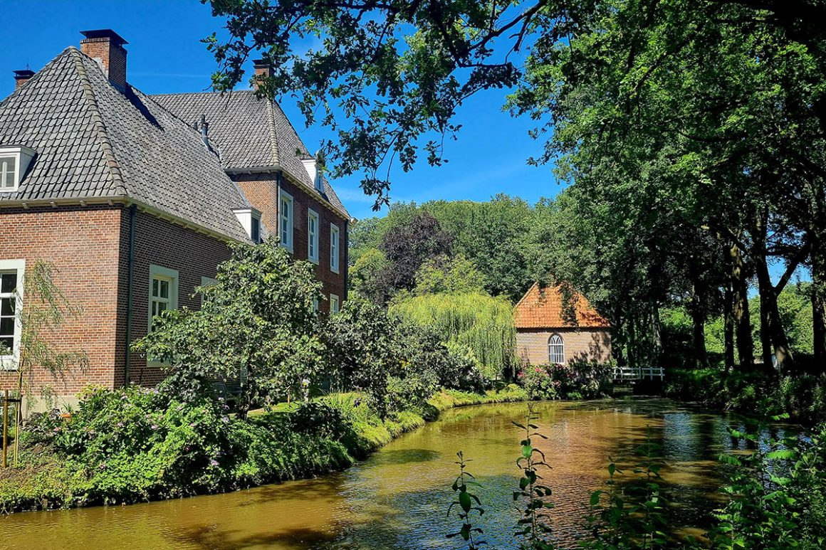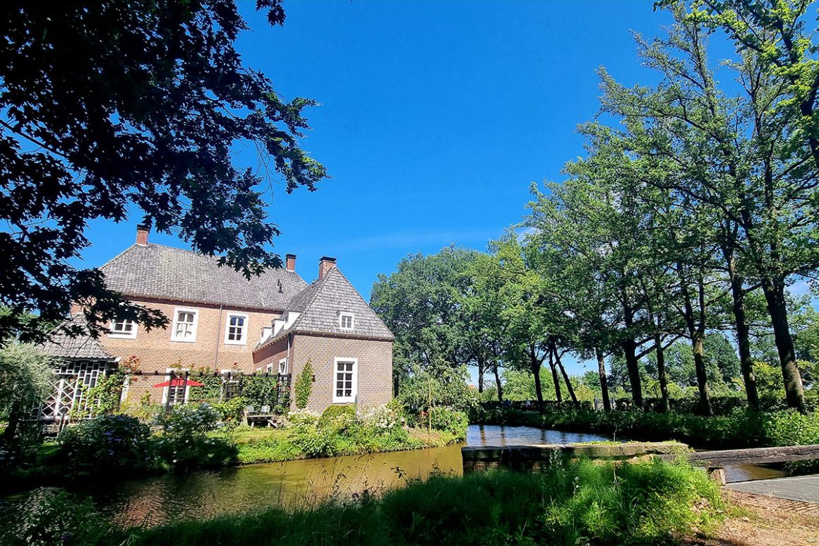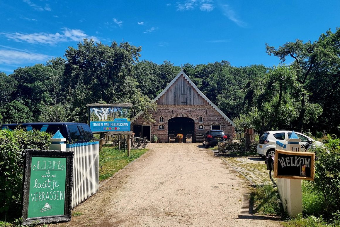 Vanaf hier volgen we de rode pijltjes. Een stukje langs de weg en dan linksaf richting Herinckhave. Op het eind loop je nog even rechtdoor (de rode pijltjes wijzen naar rechts) om de watermolen en het landgoed te bekijken. Én de tuinen, waar je in de zomer heerlijk kunt zitten en een taartje kunt eten.