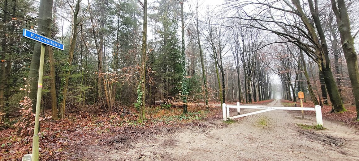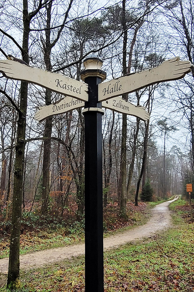 Op een gegeven moment tref je een oude handwijzer aan en aan de overkant van de straat de lange Kasteellaan met in de verte blik op het kasteel.