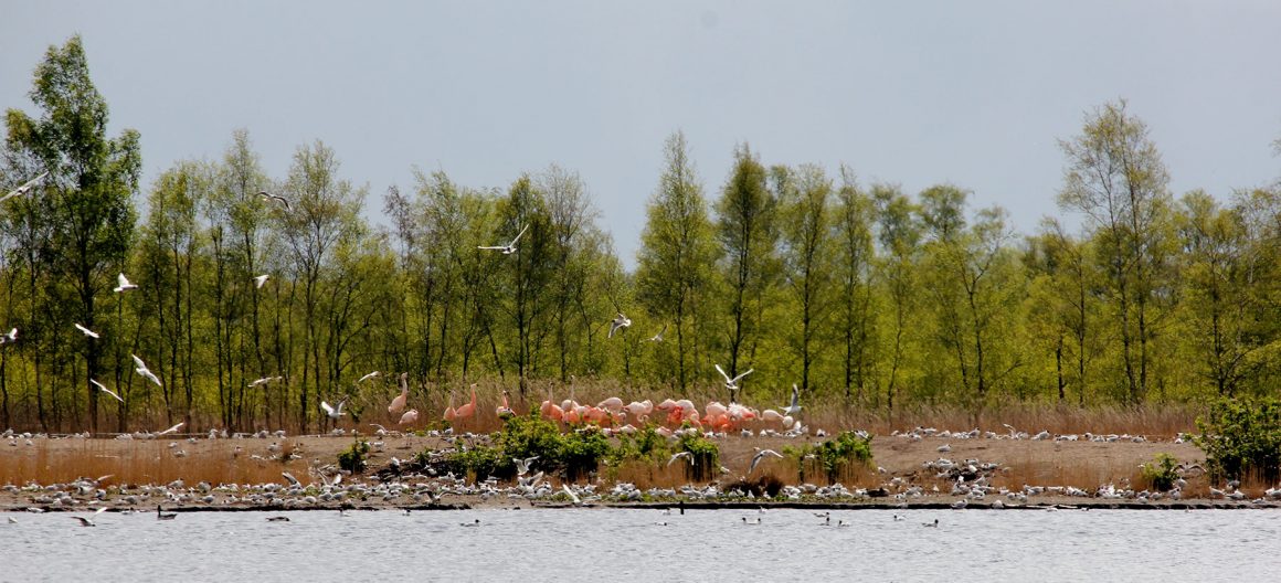 De flamingo’s leven op een eiland, das Flamingo Insel genaamd, in het midden van het veengebied.