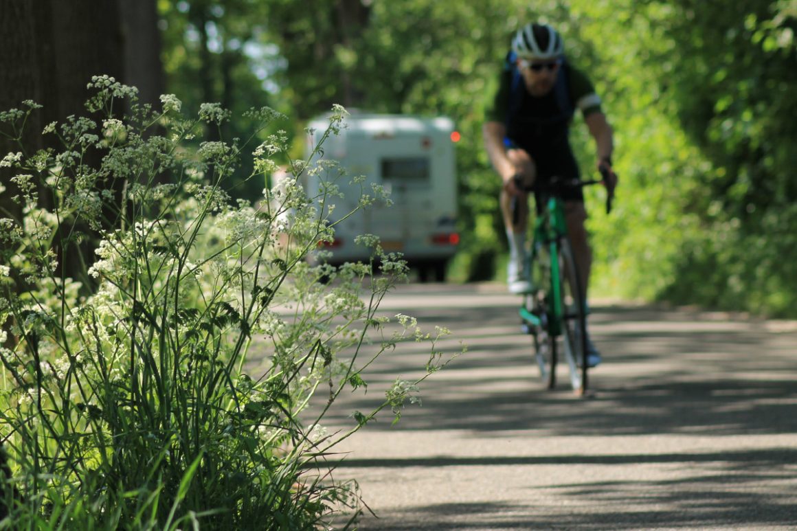 Het zicht is namelijk fantastisch en het gefluit van de vogels begeleidt ons de gehele fietstocht. ‘Koekoek, koekoek’, brullende kikkers en grazende koeien, die ons vermakelijk aankijken. En dan de geur van los gemaaid gras en de zalige geur van de bloeiende bloemen en struiken. De geur van de lente waar iedereen natuurlijk erg blij van wordt. De straatkanten worden momenteel overheerst door fluitenkruid. Fluitenkruid heeft witte bloemetjes en lange stengels die hol zijn. De plant kan wel anderhalf meter hoog worden. Ook een genot voor de bijen die dankbaar gebruik maken van de lentebloeiers.