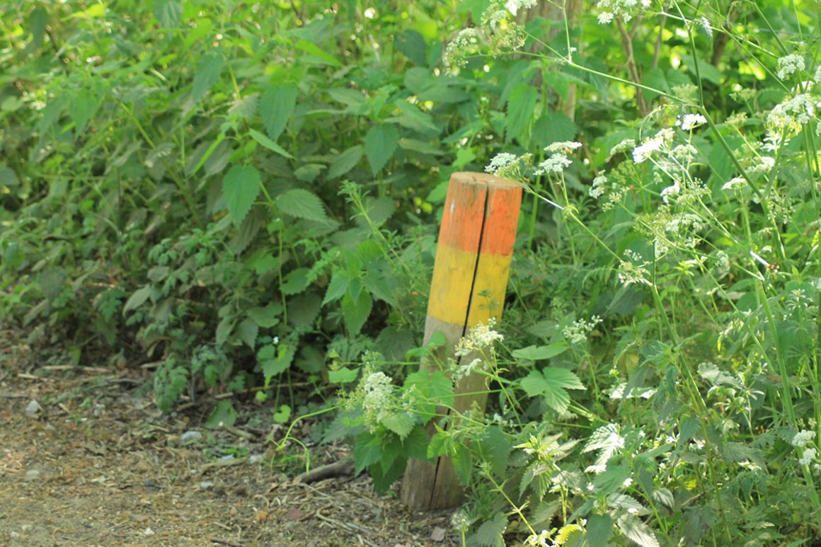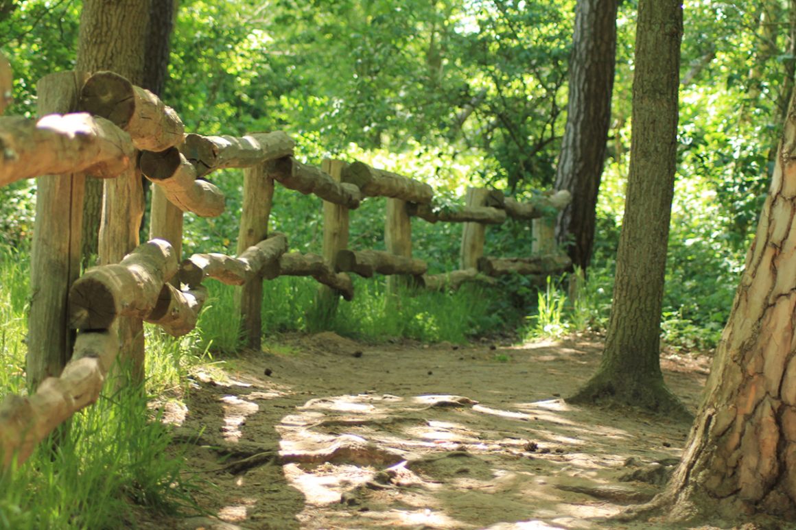 Het Lutterzand is een zandvlakte afgewisseld met bos. Diverse wandelroutes starten bij restaurant Het Paviljoen. De kortste wandelroutes zijn 1 en 3 km. Te volgen via de ronde houten paaltje met kleurtjes. Leuk om even een stukje te wandelen direct langs de Dinkel. In mei is het zand al mul en altijd weer een uitdaging om geen korreltjes zand in de schoenen te krijgen. Het wandelpad loopt gedeeltelijk direct langs de rivier en wordt beschermd door een houten hekwerk. En dan goed je voeten op beuren voor de boomstronken.