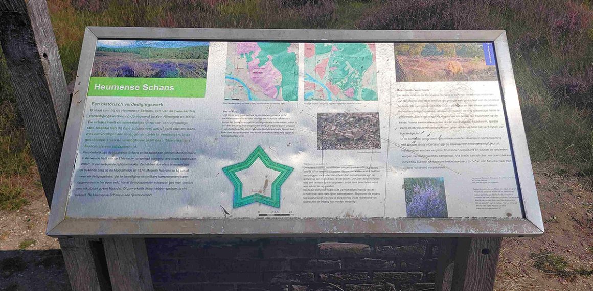 Deze gele Twee Schansen wandelroute van ruim 5 km start bij het jachtslot, voert over het landgoed, langs de moestuin en kassen, over de natuurbegraafplaats, de heide, de Heumense Schans en Mookerschans met uitgebreide natuur, uitkijkpunten en een uitkijktoren. Middels deze wandelroute heb je al een ruim beeld van het gebied.