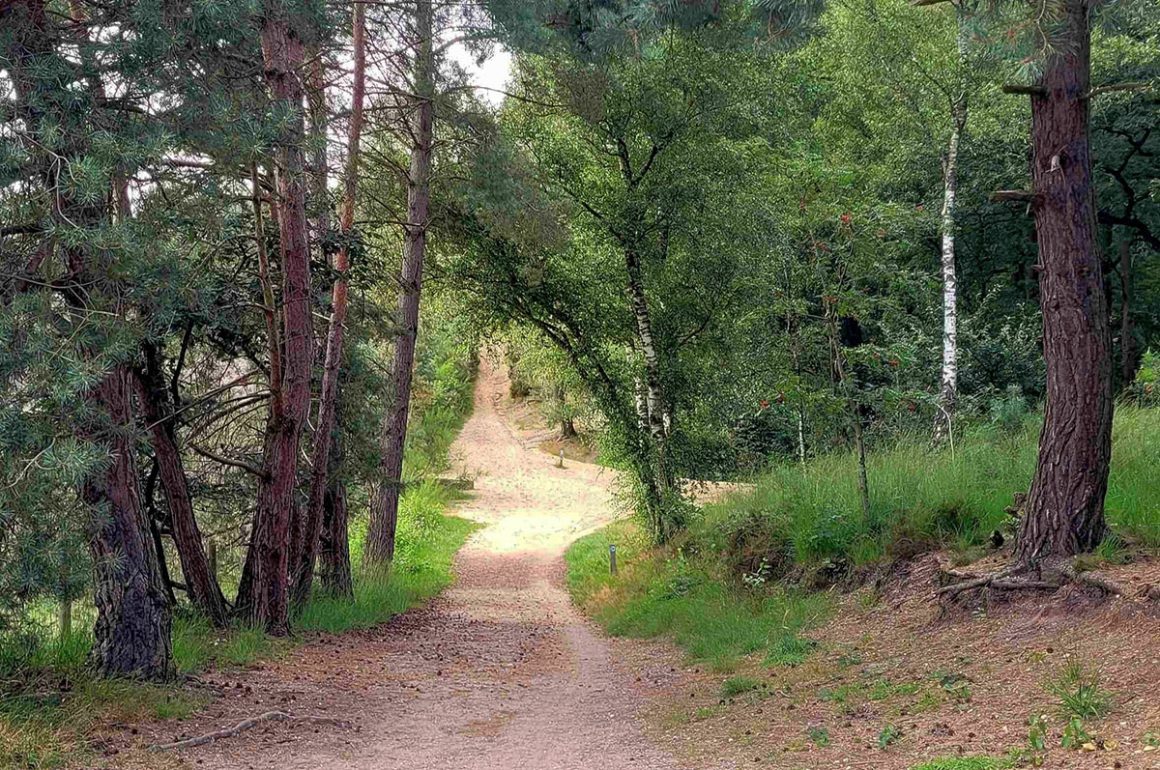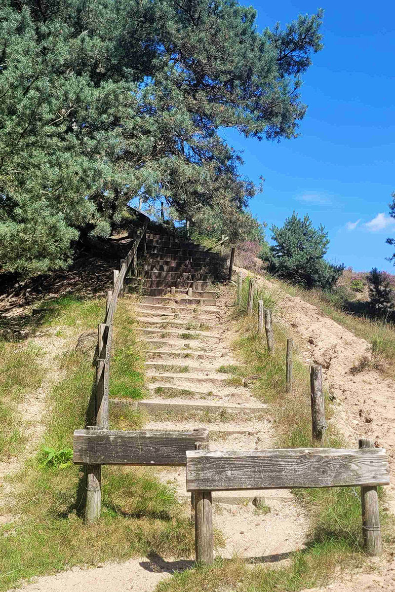 Iets verderop is het weer afdalen via een steile trap en wandel je verder door bosgebied met kleine heidevelden richting de Mookerschans.