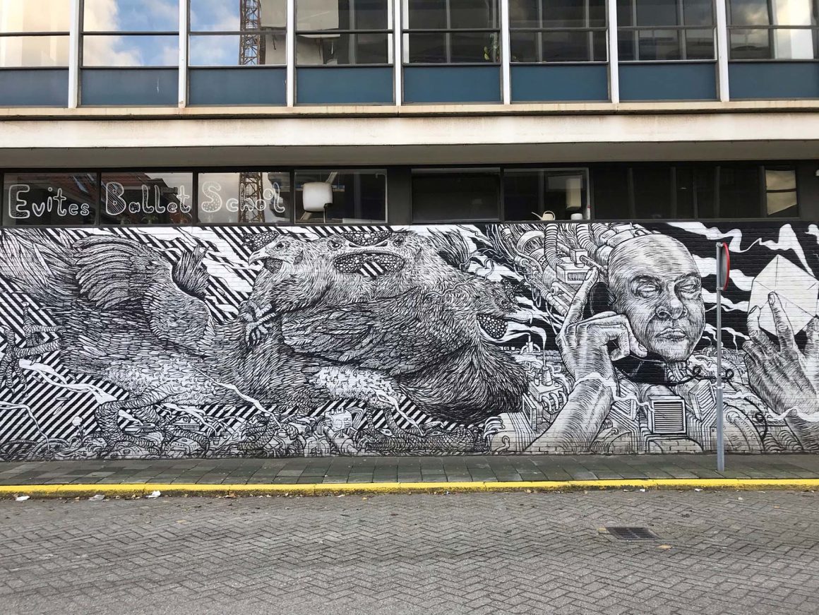 Om de hoek vind je het kunstwerk van Bier en Brood. Er is zoveel te zien in dit zwart-witte kunstwerk, het gaat hier om bijna 100 meter aan illustraties. Het loopt om het oude kantoor van de Keuringsdienst van Waren heen en beeld daarmee allerlei experimenten uit, vandaar de naam ‘Het Laatste Onderzoek’. Loop dus vooral een rondje om het gebouw.