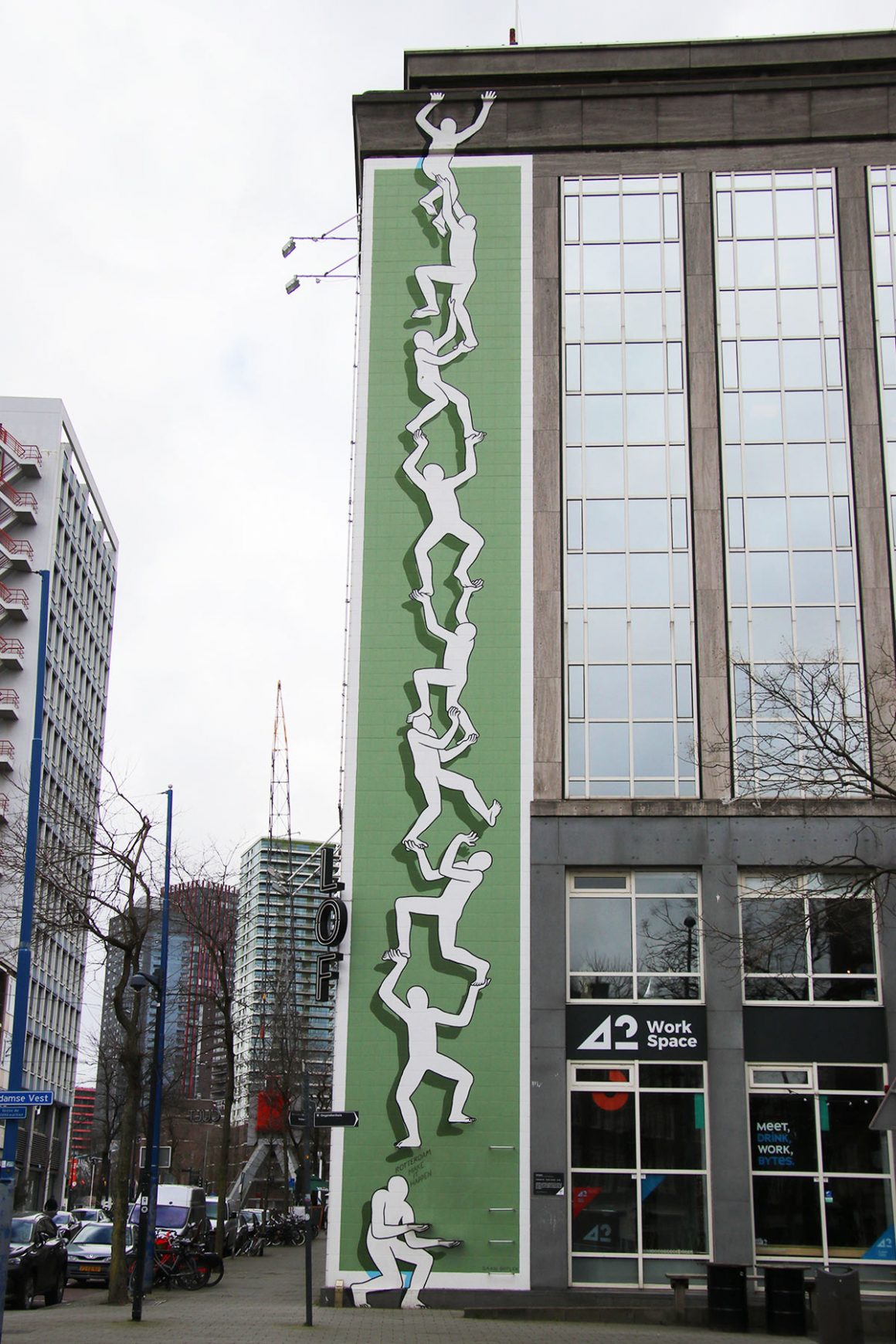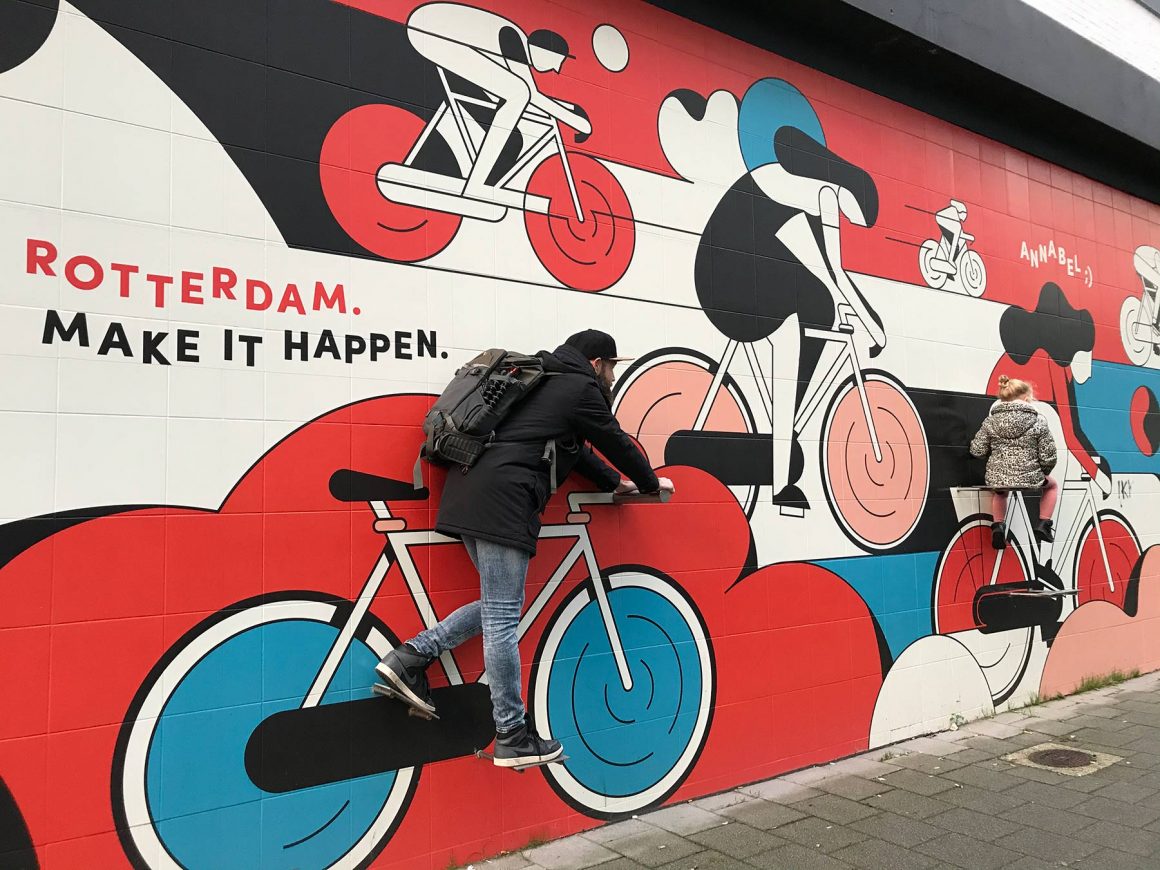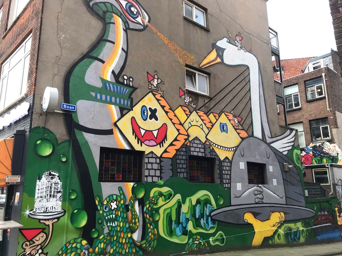 In de kleinste zijstraten van Rotterdam kom je diverse kunstwerken tegen. Een daarvan is de muurschildering van Lastplak. Typisch Rotterdam is wat je ziet, verschillende iconische gebouwen zijn hier op een eigentijdse manier uitgebeeld. Zo zie je de Erasmusbrug als zwaan, de gele Kubuswoningen, de Euromast en de Markthal. Een mooi begin om je route te starten.