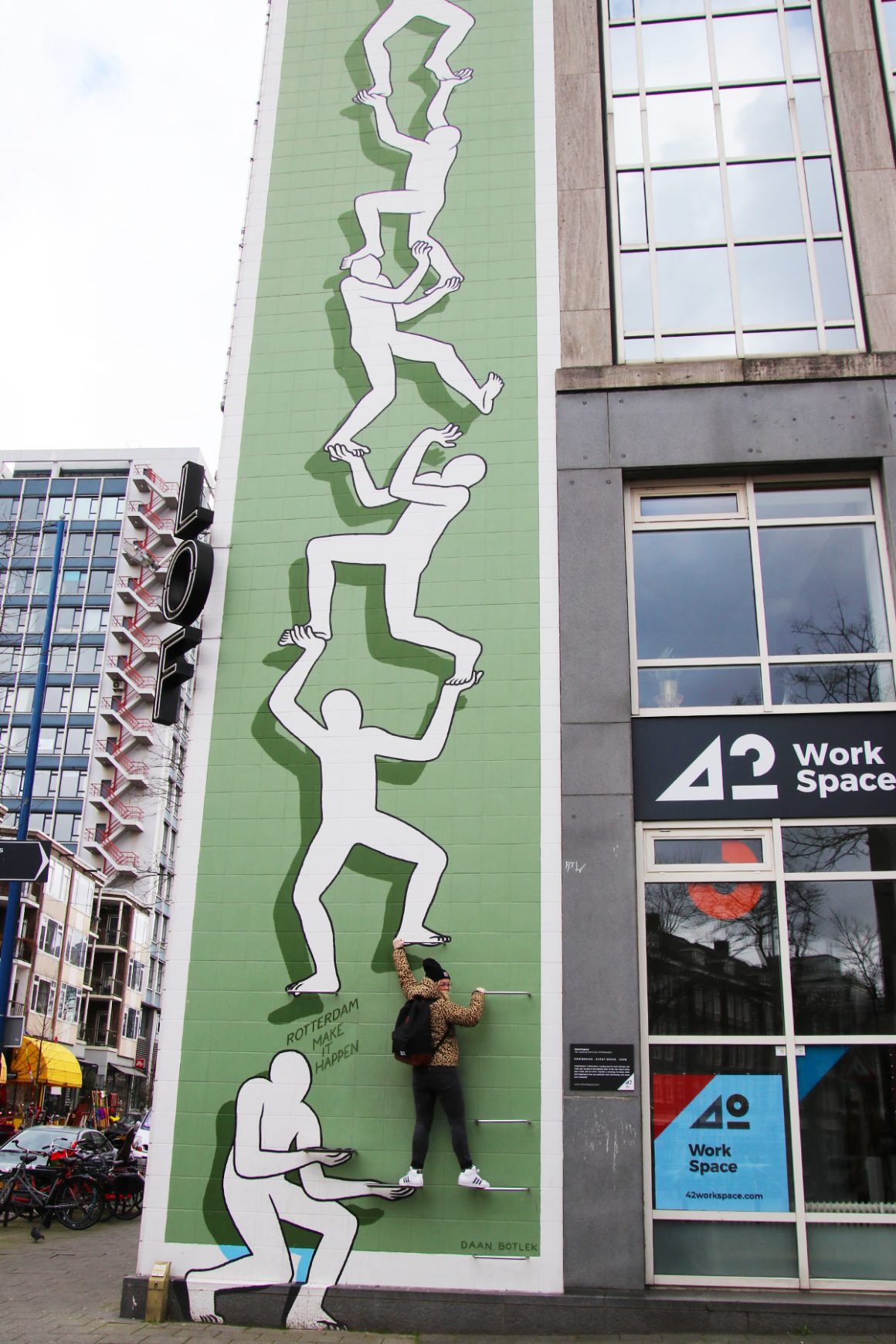 menselijke piramide. Er zit een klimrek in de muur zodat je kan deelnemen aan het kunstwerk. Neem plaats en ga op weg naar de top.