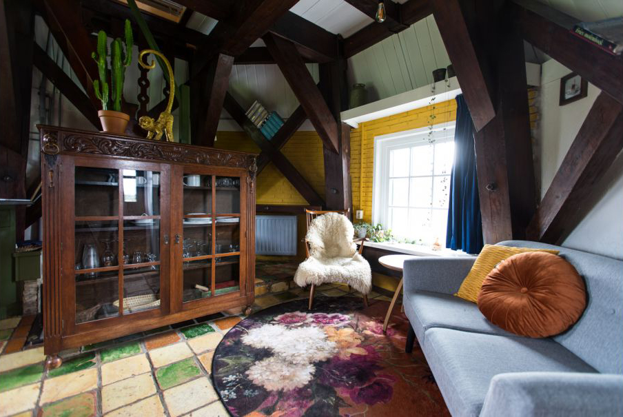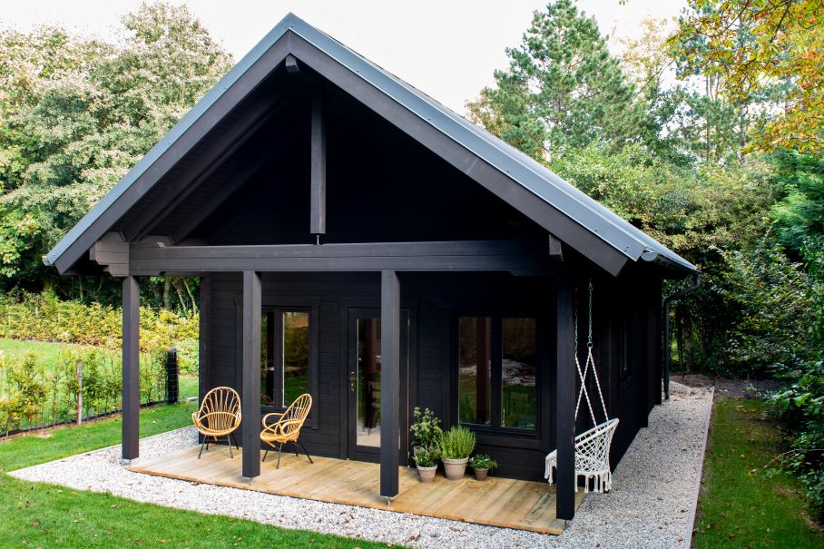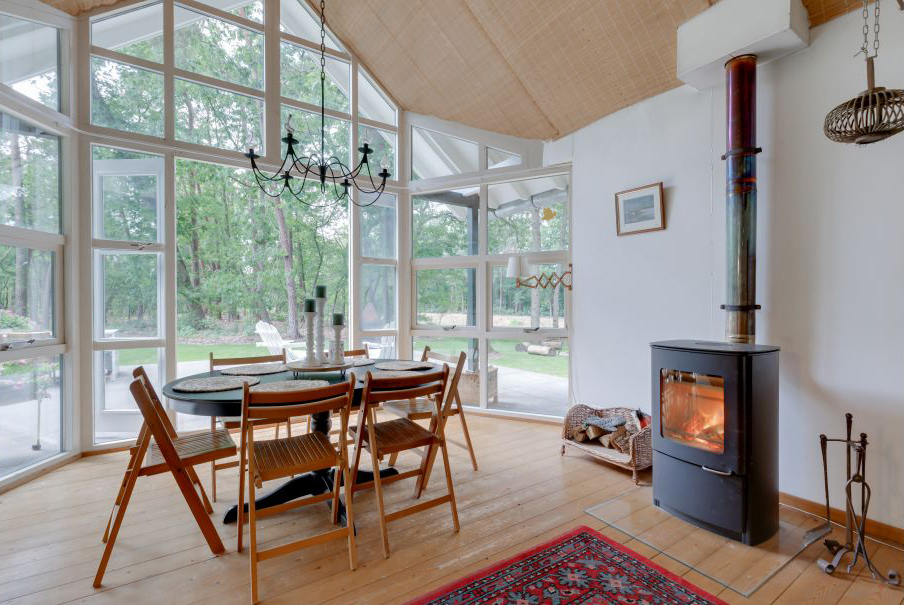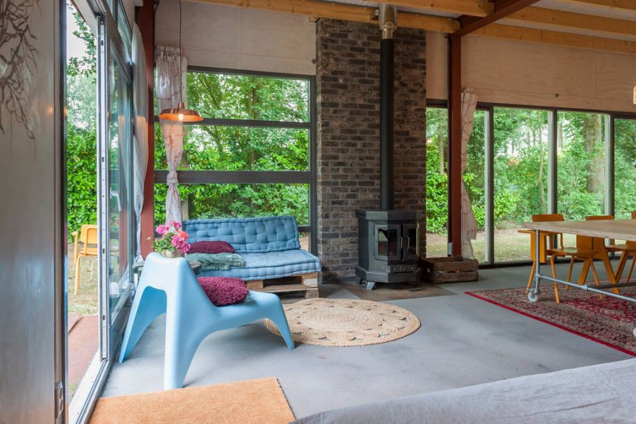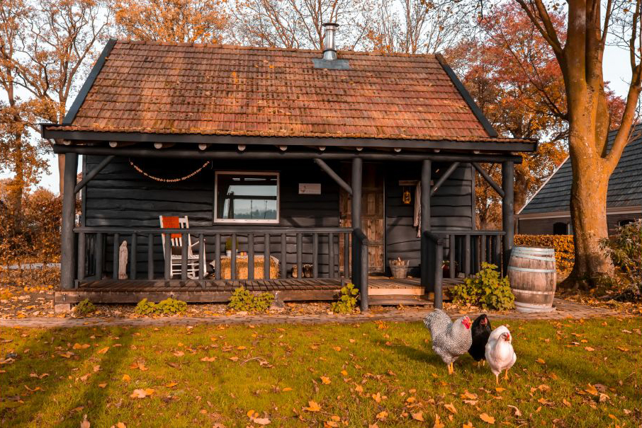 In Laren, Gelderland, ligt dit mooie knusse houten huisje op een boerenerf. Niet heel verwonderlijk dat er ineens een kip voorbij loopt. Of, vanaf je veranda, reeën ziet grazen. Hoe gezellig is dat.