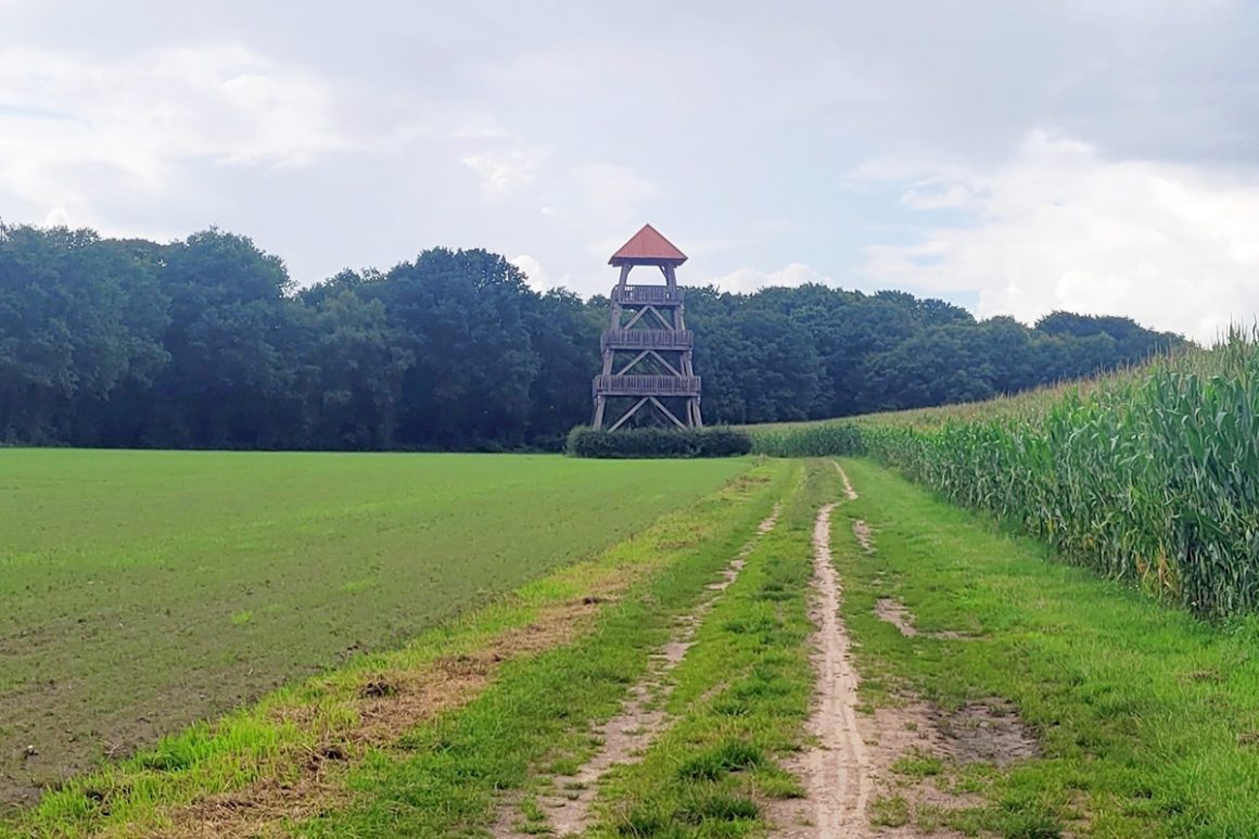 Vanaf de molen wandel je eerst tussen de landerijen door over een stil asfaltweggetje. Je wandelt richting wandelknooppunt I43, waar je eventueel kunt overstappen op de Achterveldroute (de groene route). De oranje route gaat verder door een bospartij, waarna je via een zijpad langs de opvallende uitkijktoren komt. Deze 16 meter hoge houten toren kent drie verdiepingen en heeft een prachtig uitzicht over Neede en omgeving. Het bord onderaan de toren geeft informatie over het ontstaan van de Needse Berg en de vogels die in dit gebied voorkomen.