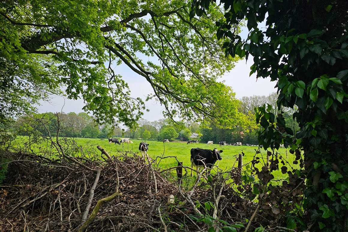 Niet voor niks wordt dit de Lonnekerberg genoemd. Links en rechts zien we bomen en voor de rest niets: rust en genieten. Op een gegeven moment zien we aan de linkerkant de Lonnekermeren waar een aantal eenzame vissers hun geluk beproeven. Nieuwsgierig volgen een aantal koeien ons pad terwijl het merendeel ons negeert en ongegeneerd liggend herkauwd.