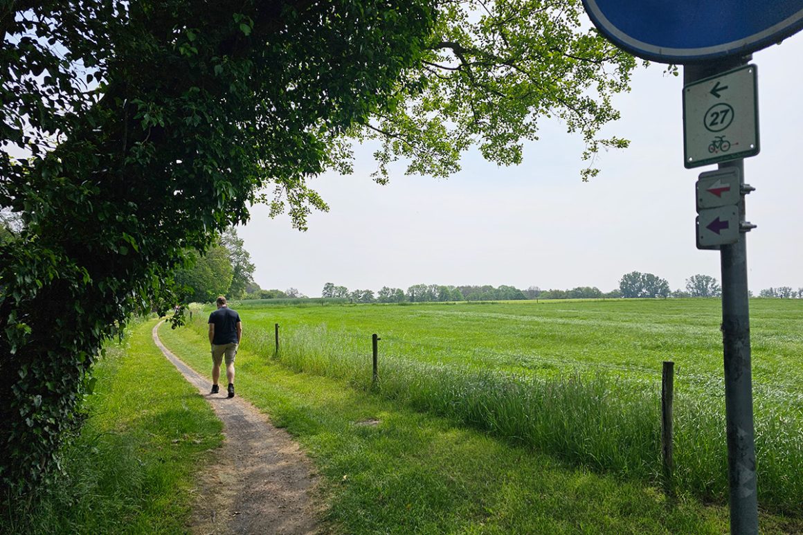 Op het dorpsplein slaan we de weg in richting het voetbalveld. Daar gaan we links een fiets/wandelpad in en vervolgen onze weg aan het einde rechts om direct weer links te gaan.