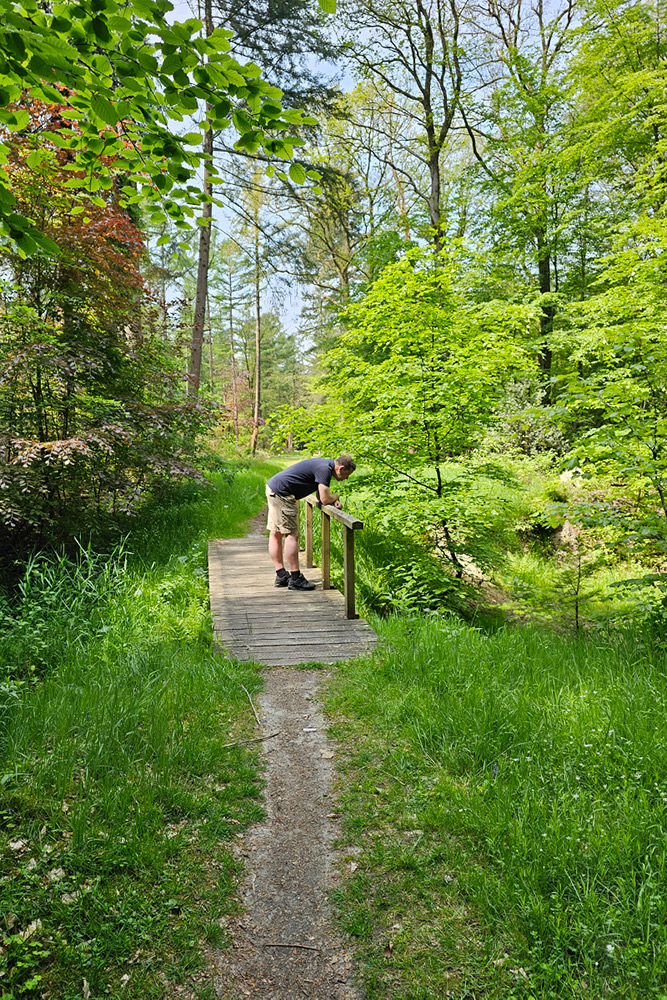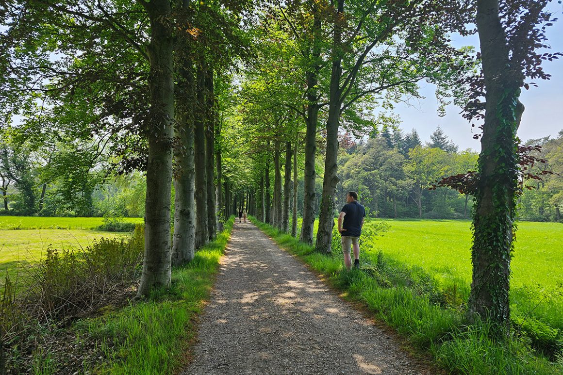 We wandelen langs een breed karrenspoor met een fietspad er langsheen en rechts opnieuw een meertje. Iedere keer staat er meer in bloei. We lopen langs een prachtig oud boerderijtje aan een laan met links en rechts bomen en vele bloeiende rododendrons. Dit pad leidt ons richting het Universiteitsterrein. Een verrassend leuk pad (hardlooproute voor studenten). Achter de smalle strook bomen links en rechts liggen kleine weilandjes en een villa van een vroegere textielbaron.