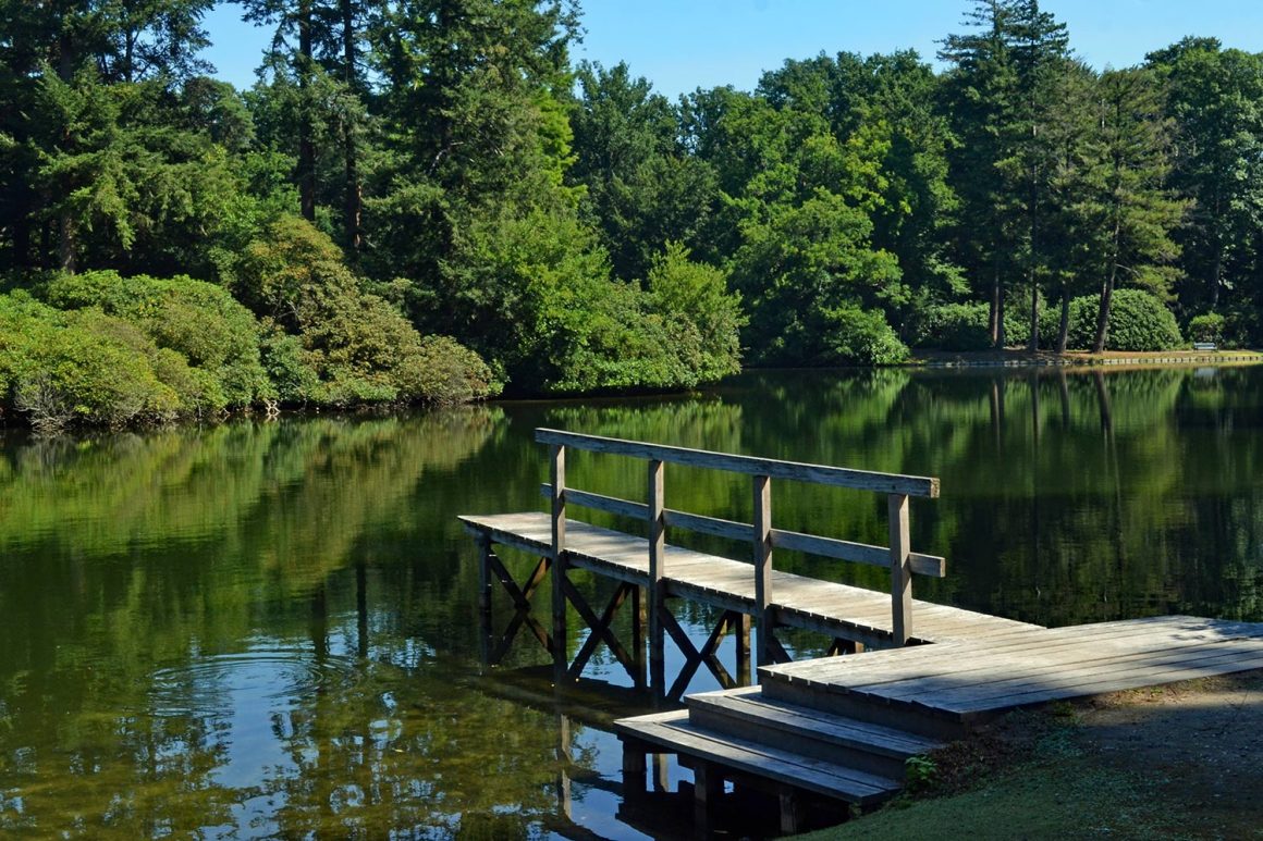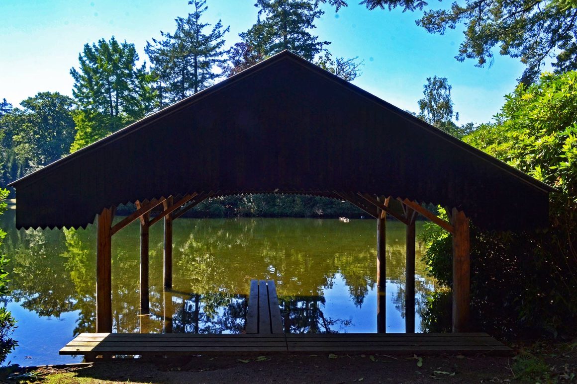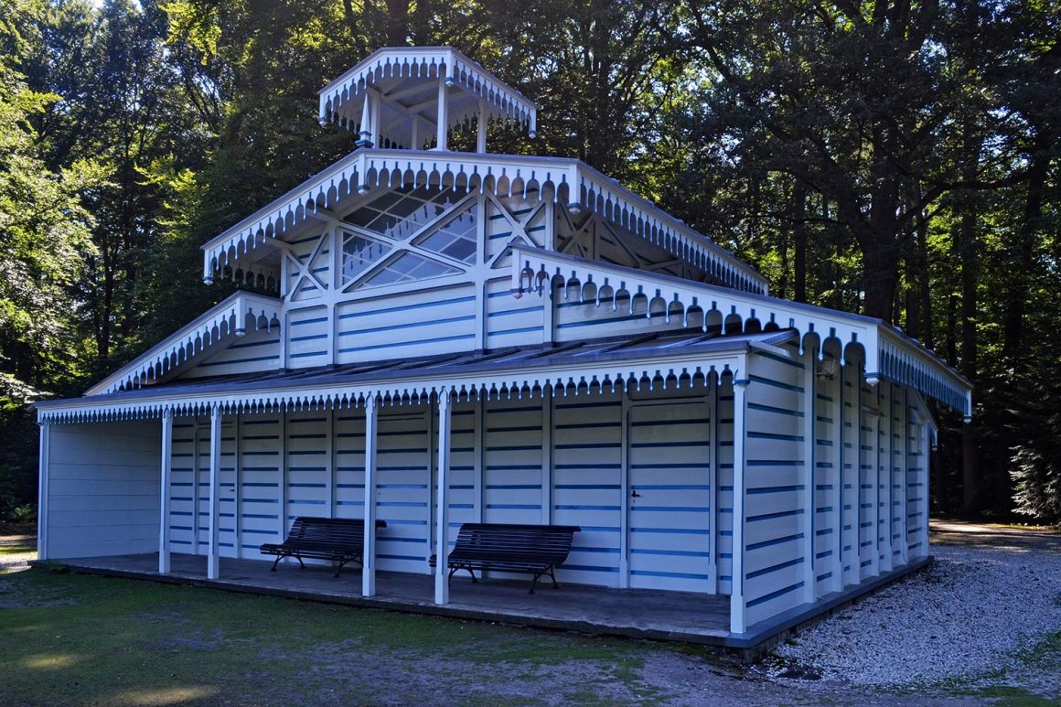 Kijk, daar zwemt Koning Willem III! Hij neemt een duik van de steiger nadat hij zich in het Badpaviljoen heeft omgekleed. Dit mooie authentiek gebouw is speciaal voor hem gebouwd omdat hij graag zwemt. Geniet van het uitzicht over het meer met de prachtige bomen en, afhankelijk van het jaargetijde, de rododendrons.