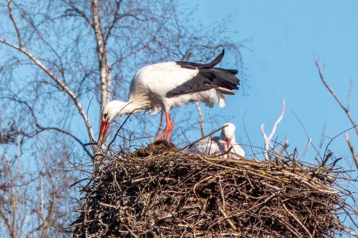 Het pad loopt verder langs het water. Links van ons zien we een ooievaarspaartje, waar al gebroed wordt. Altijd weer een mooi gezicht en een teken van de lente. We komen weer uit op de ‘doorgaande weg’ en gaan opnieuw rechtsaf. De A28 raast links van ons, maar gelukkig ligt er een bosgebied naast en het Noord-Willemskanaal stroomt er langs.